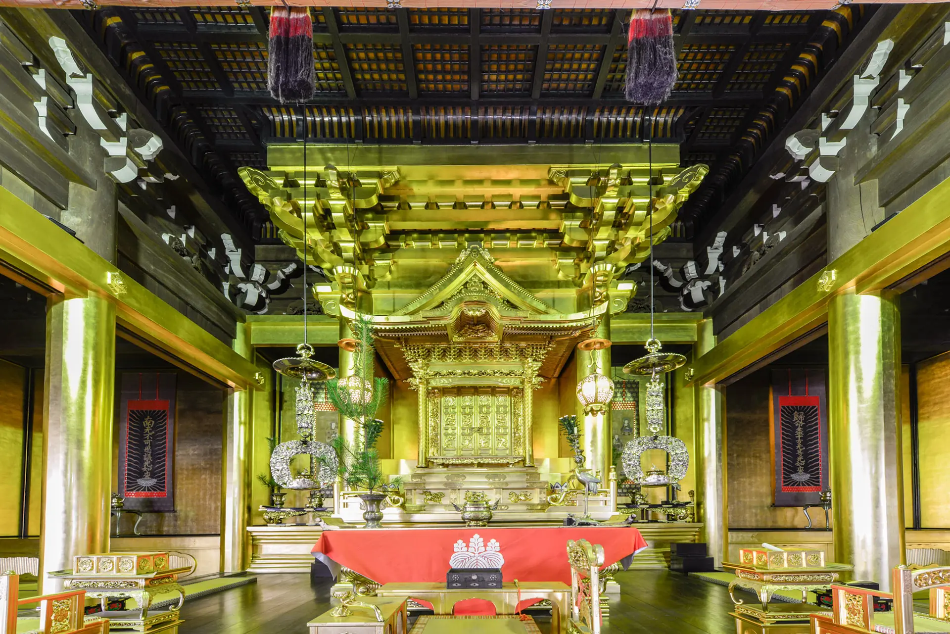 「如来堂」のお堂の中は、精緻な彫刻が施された組物や欄間、金箔で華やかに装飾された荘厳な空間で、彫刻や金箔で装飾された黄金の「宮殿(くうでん)」が象徴的です。