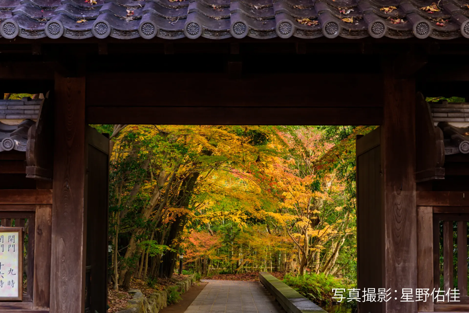 御廟拝堂近くの小さな門から撮影された紅葉で、とても風情があります。