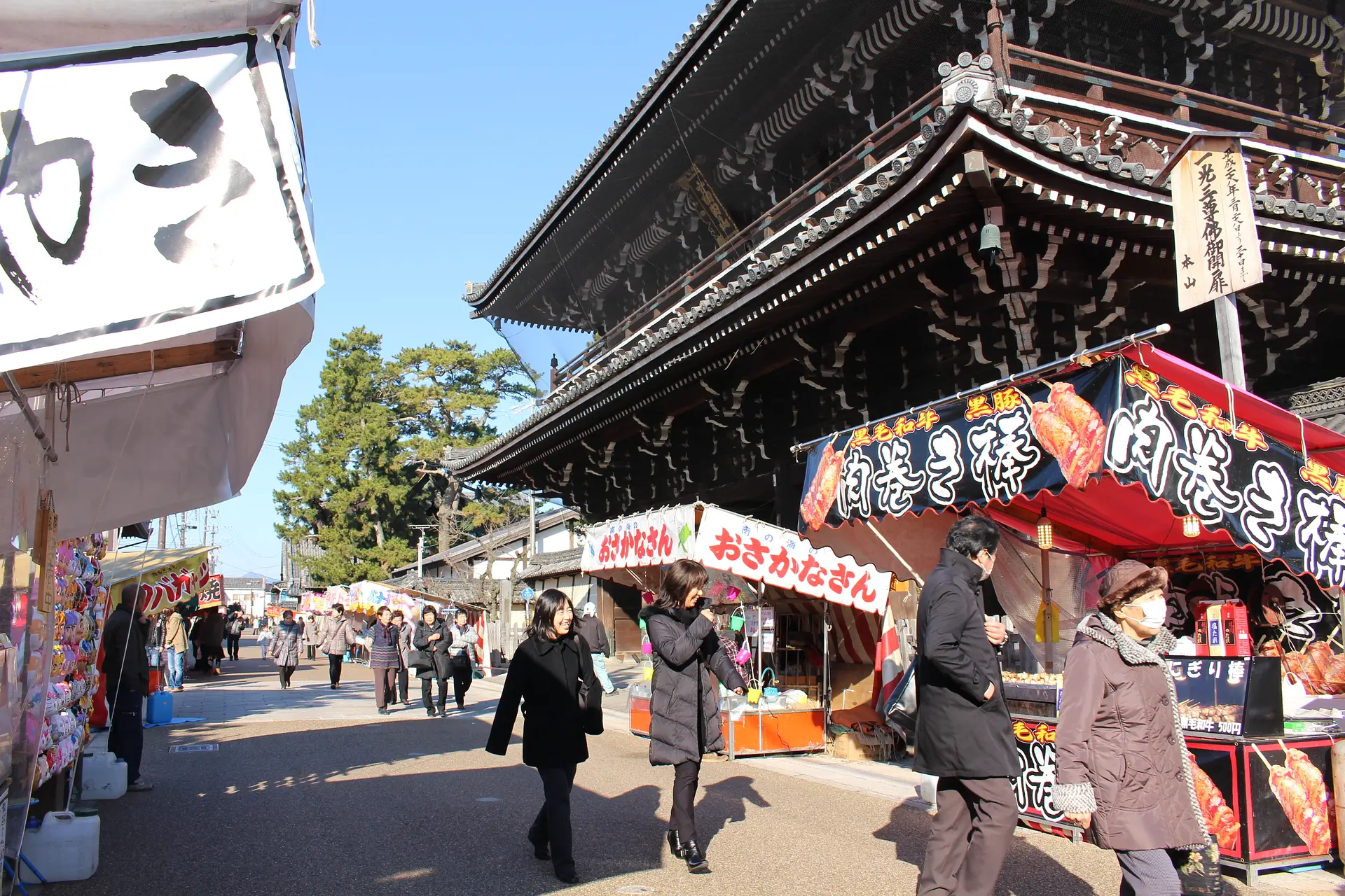 「お七夜さん」と親しまれ、門前に広がる寺内町(じないちょう)には、露店が並び、毎年多くの人々が訪れます。