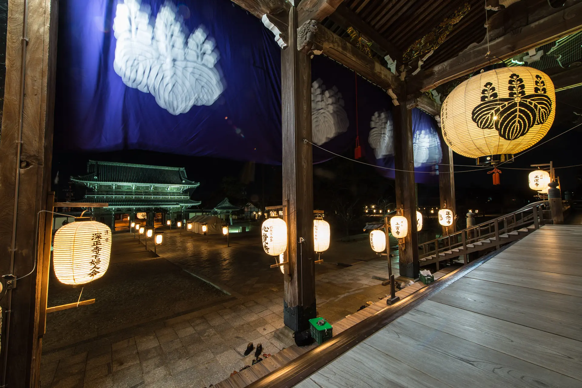 「お七夜さん」の時期のみ、提灯に灯りがともされた境内を見ることができます。昼間とはまた違った奥ゆかしい雰囲気が楽しめますよ。