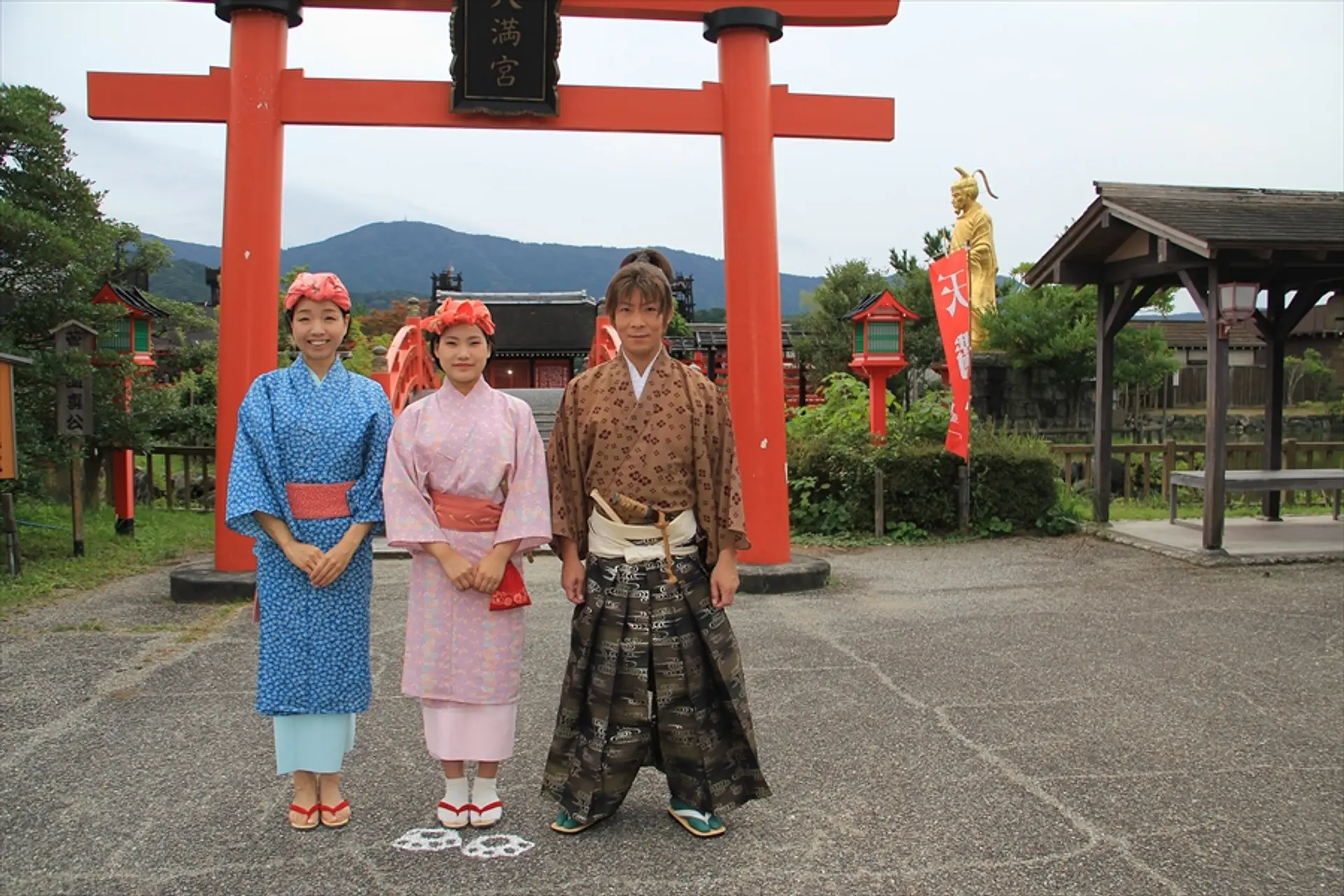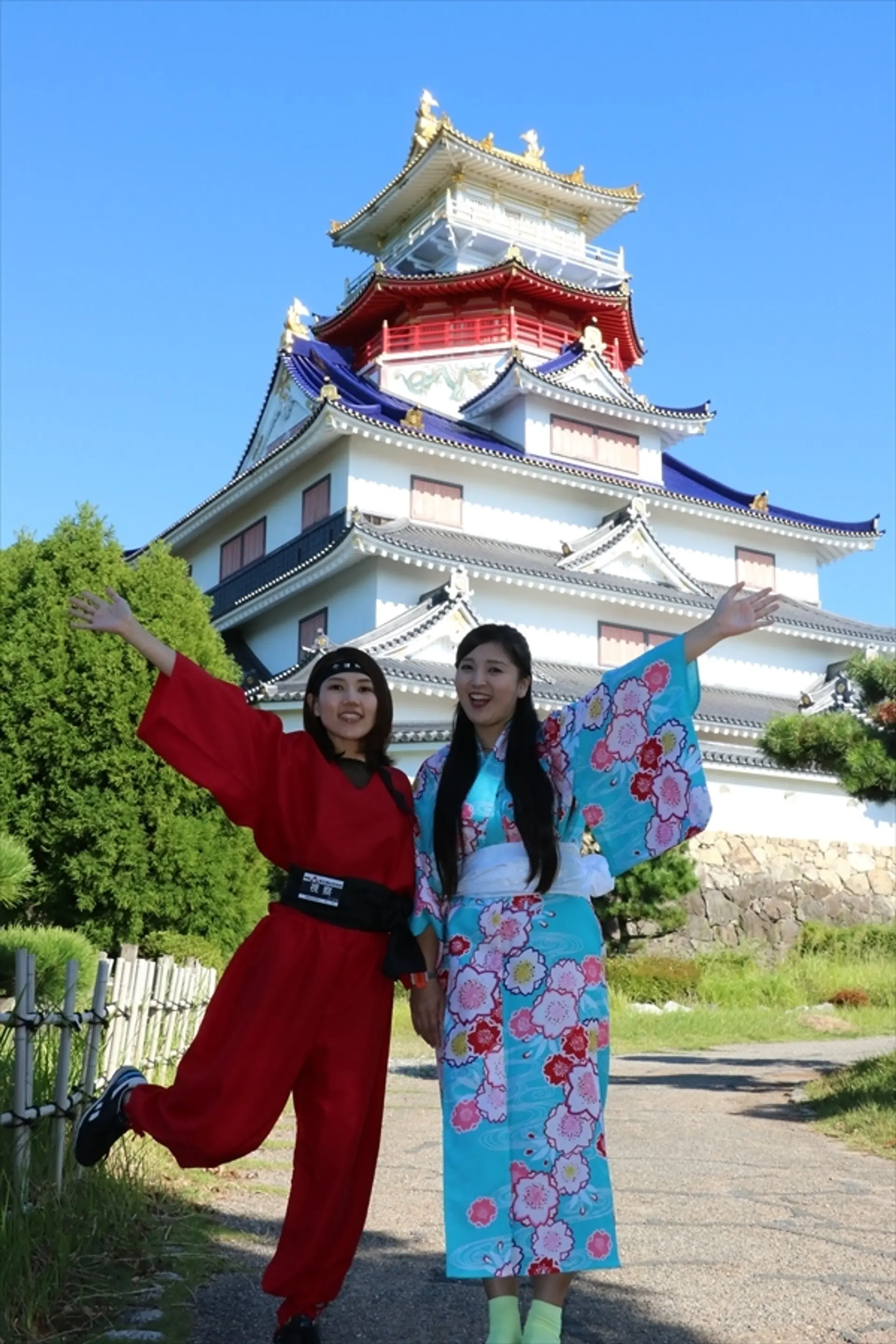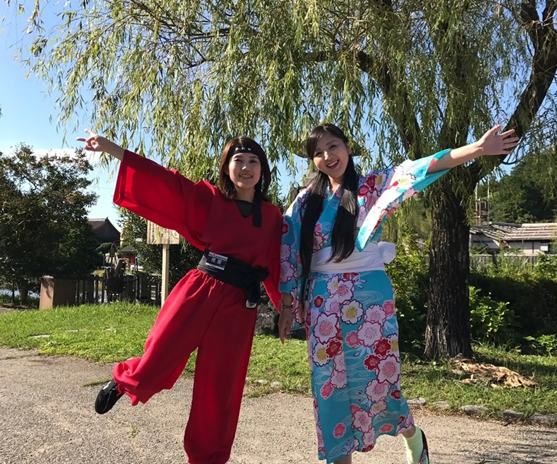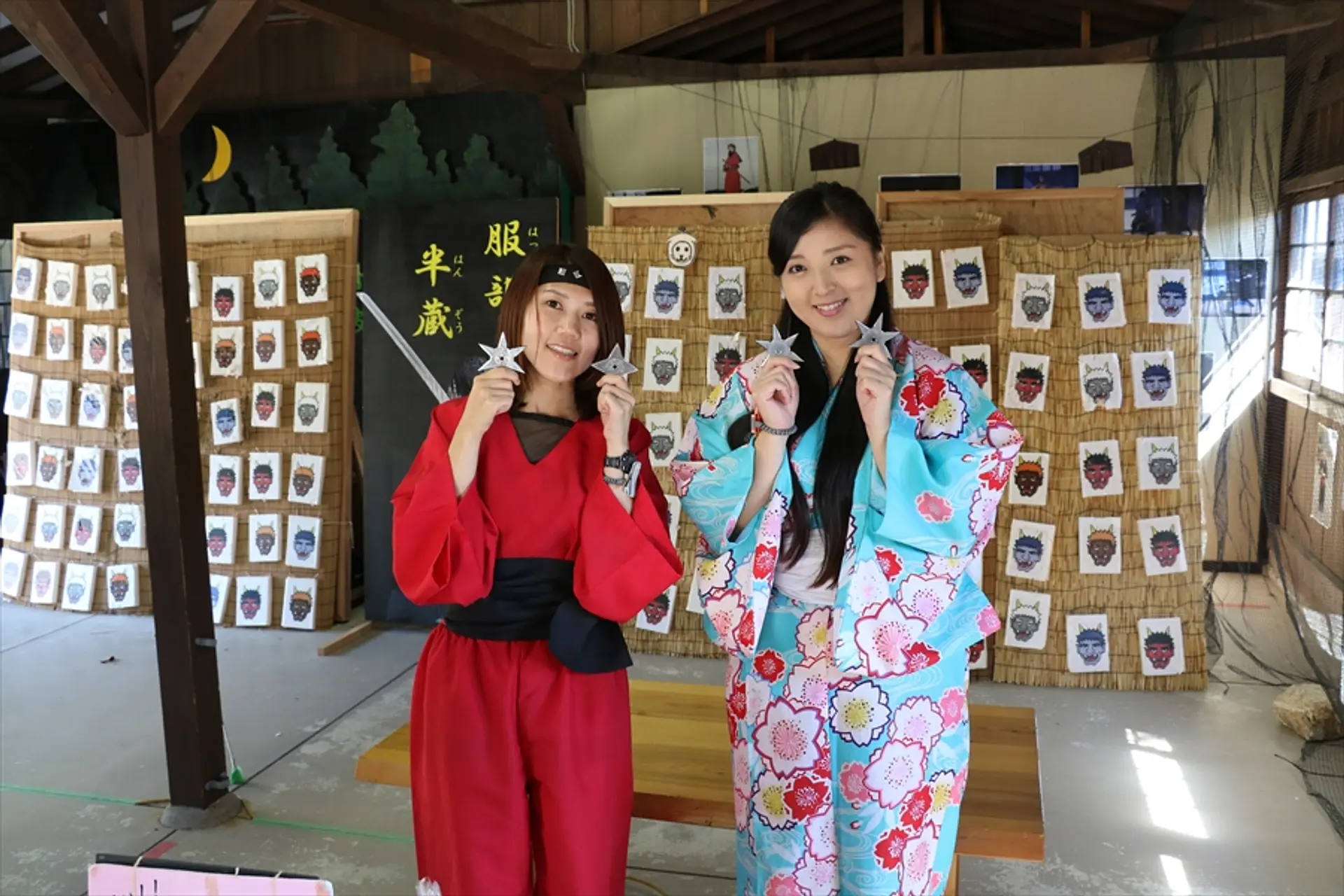 城内を散策する前に・・戦国時代にふさわしく大変身!こちらの変身セットのレンタル料は入園料に含まれています。せっかくなので戦国気分を徹底的に満喫しちゃいましょう!忍者装束と3種類の着物から自由に選べますよ♪ もちろん男性用もあります。
