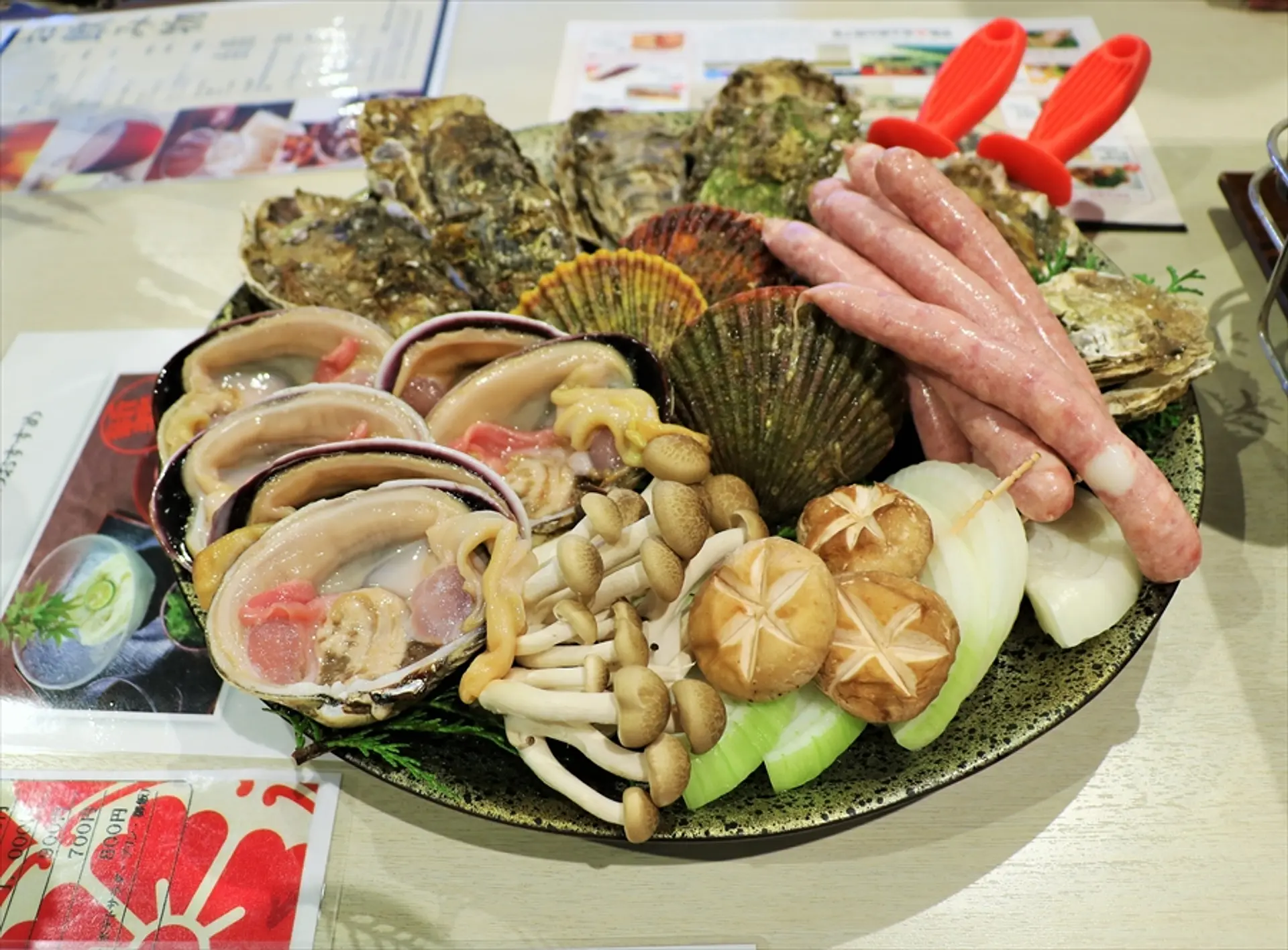 地元で獲れた、牡蠣や大アサリなどの新鮮な海の幸が、お皿からこぼれそうなくらい盛られています!