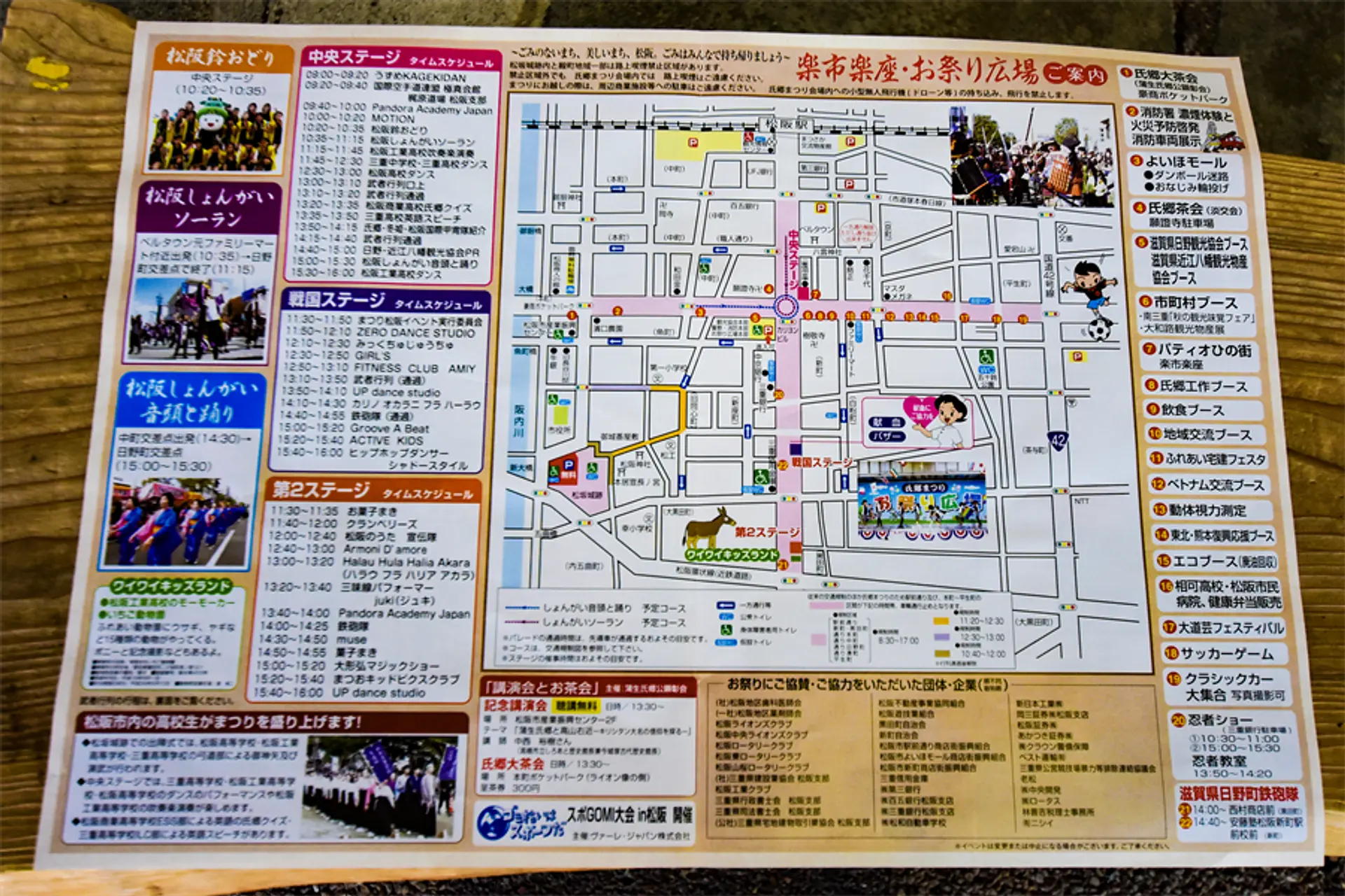 チラシには、各ステージのタイムスケジュールや、パレードの通過予定時刻が示されています。