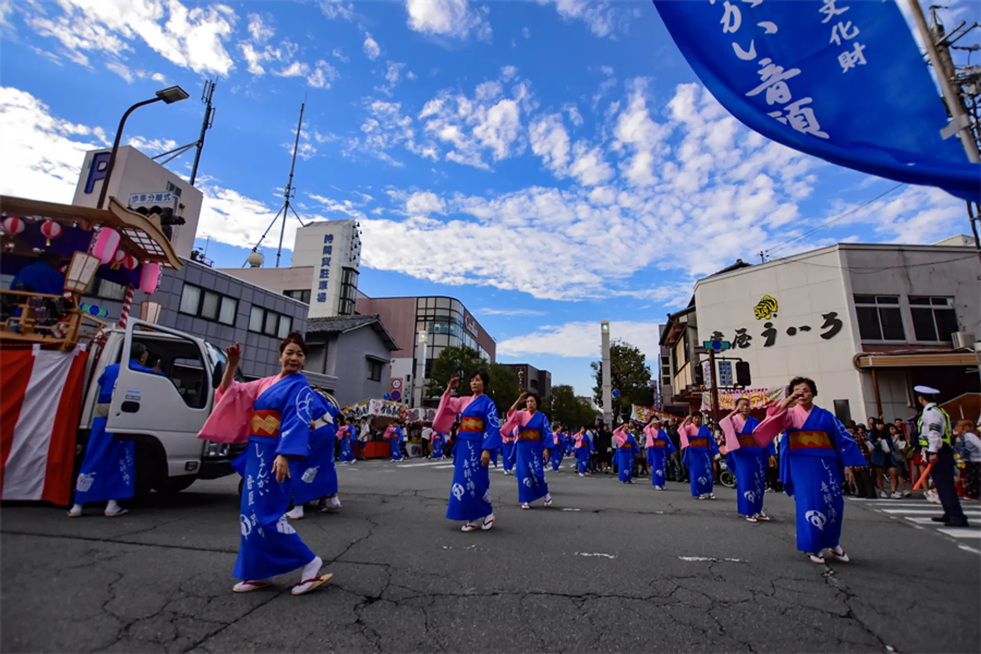 「しょんがい」は「しょうがない」の意味で、松坂城が築かれたときに重労働を課せられた農民、村人たちが踊ったのが始まりとされています。鮮やかな青色の着物を着た人々が、踊りながら交差点を回ります。