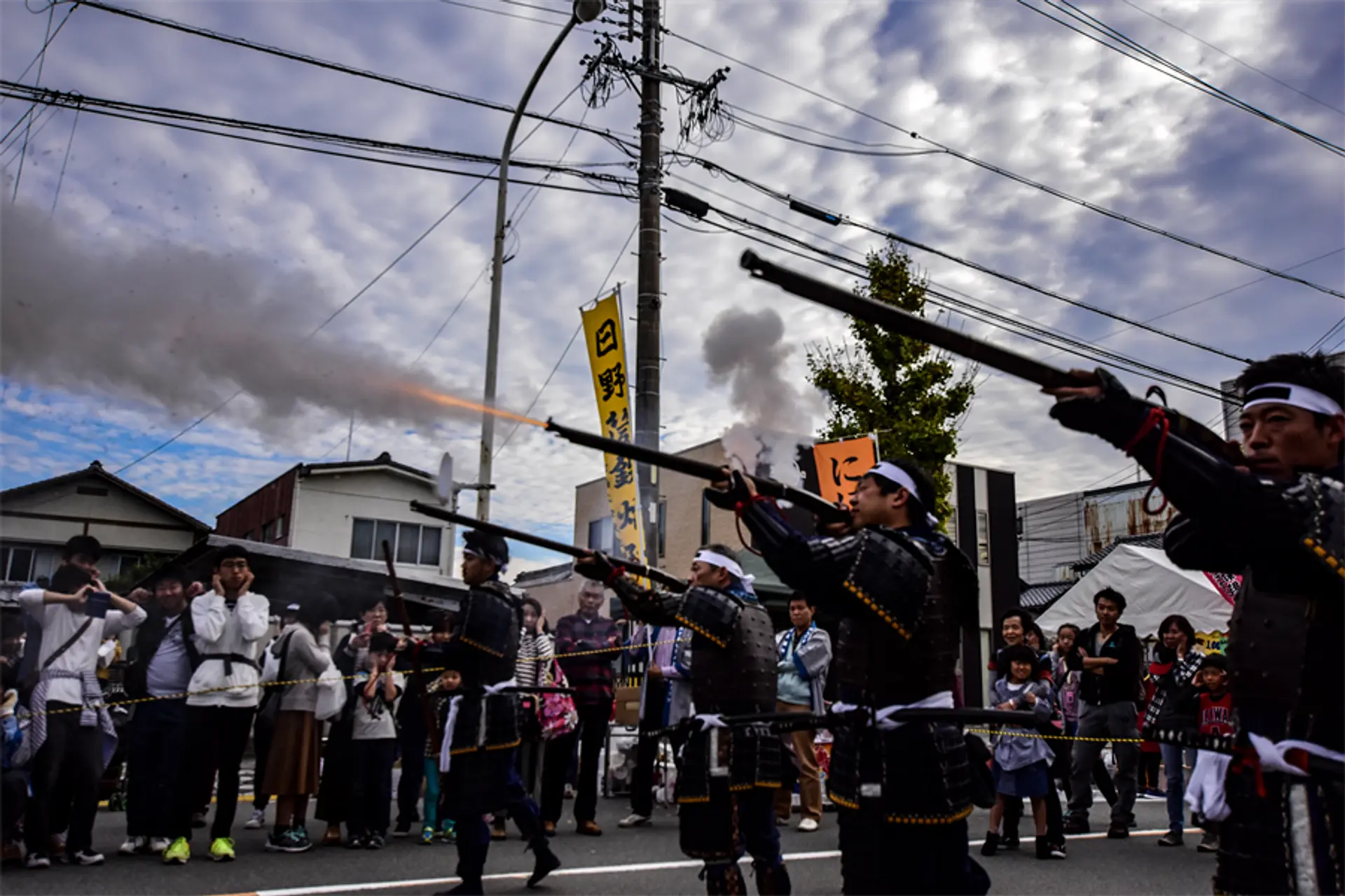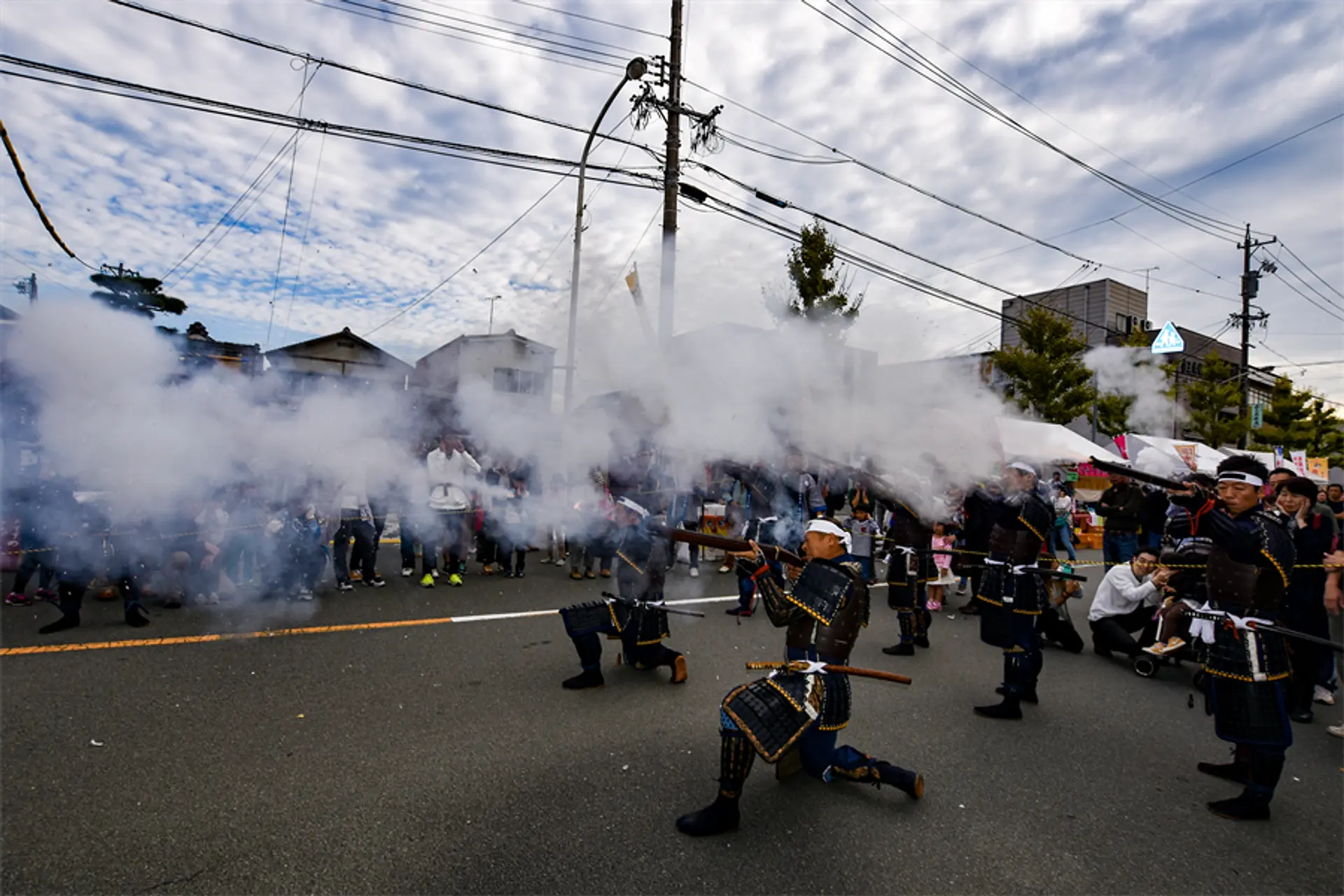 日野町交差点から、徒歩でおよそ6分ほどのところにある新町で行われた日野鉄砲隊の実演。安全のために弾なしの実演なのですが、実物の火縄銃が使用されます。
