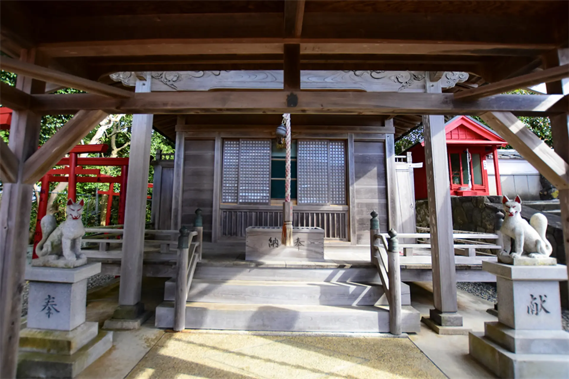まずは、本殿のお参りから。お稲荷さんなので、きりっとした狐の像が迎えてくれます。二礼、二拍手、一礼。