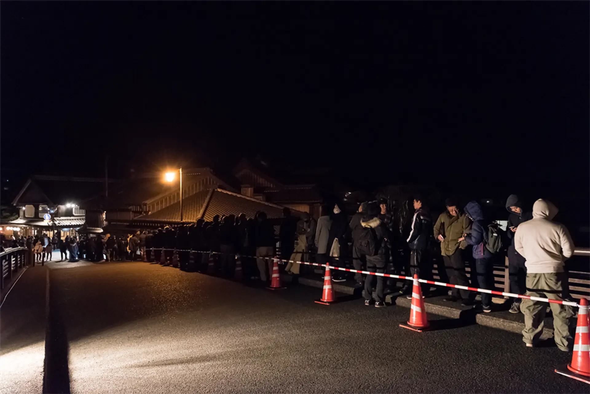 行列は赤福本店裏の橋を越え、左へ曲がり五十鈴川沿いにずっと続いています。