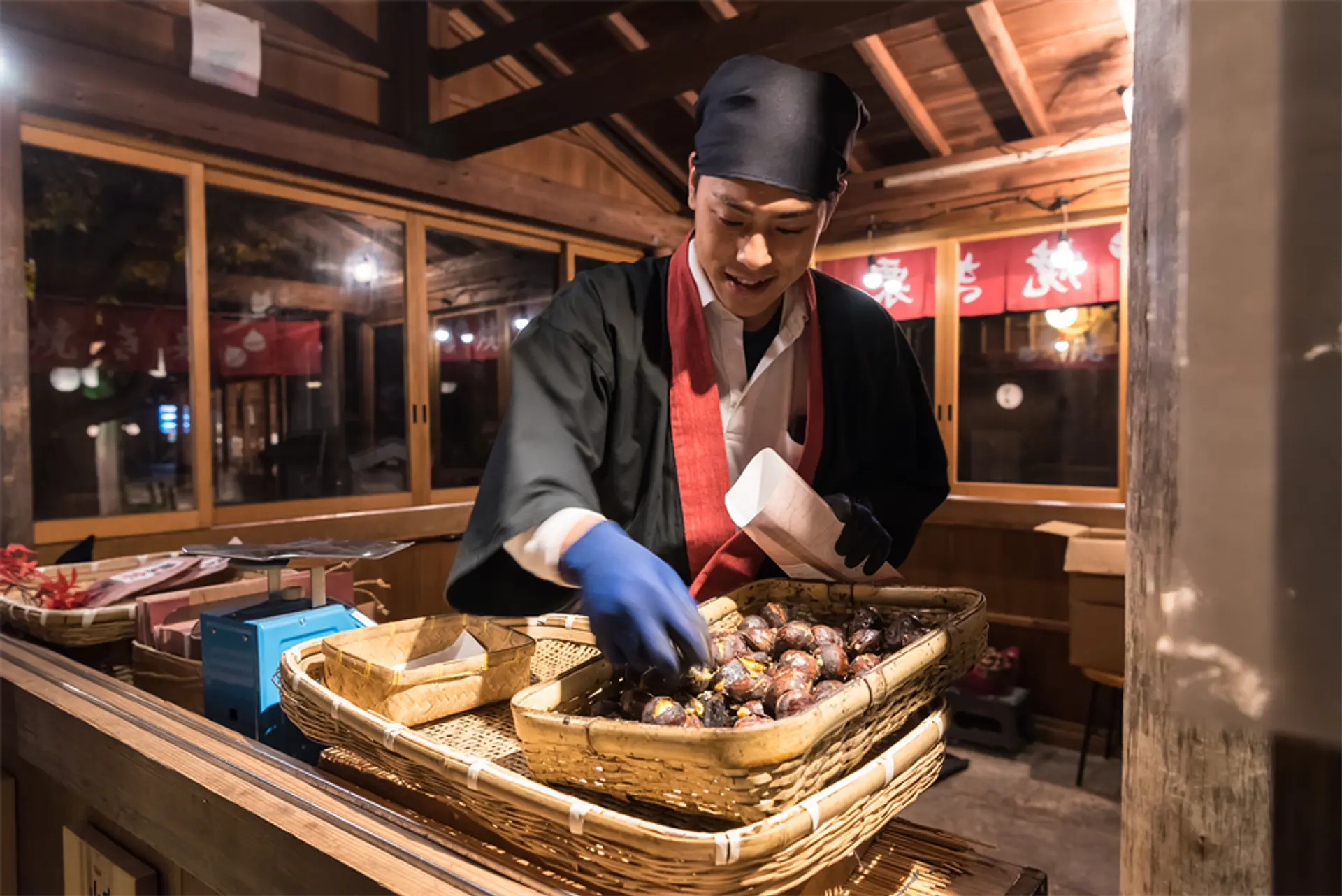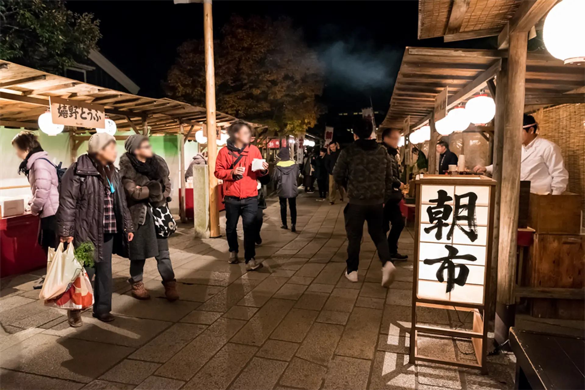 1日には4時頃から「朔日朝市」が催されており、みずみずしい季節の野菜や果物、嬉野とうふ、牡蠣燻製、きんこ芋など地元生産者が作る加工食品、焼き栗の屋台などなど、様々な商店が軒を並べていて、早朝からとても賑やかです。