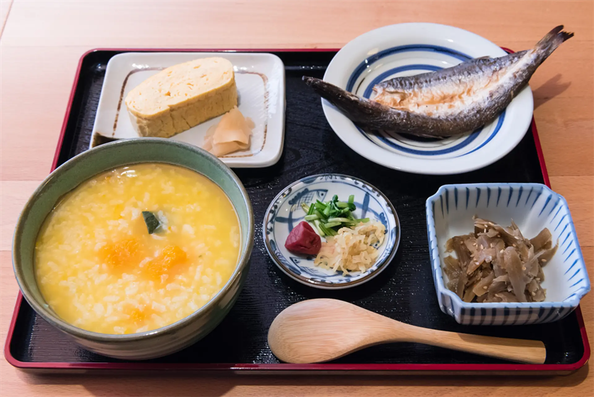 小ぶりの丼にたっぷり入った熱々のお粥と、だし巻き玉子、季節の焼き魚(取材時はカマス)、小鉢(取材時はゴボウの煮物)、漬け物がセットになっています。