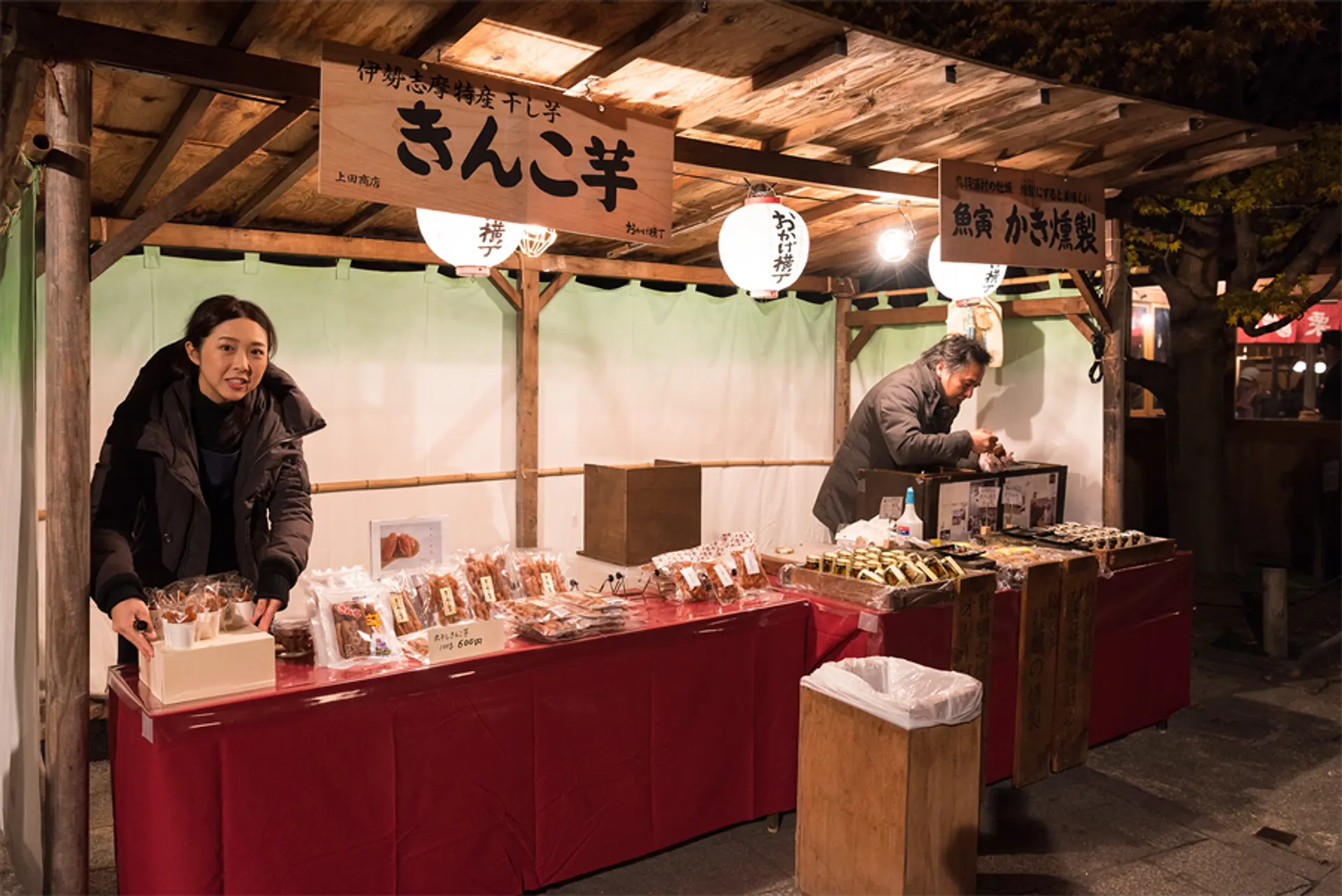 これは、月の初めに早起きをして、ひと月無事に過ごせたことを感謝し、新しい月の無事をお祈りするもの。内宮前ではこの朔日参りの参拝客をもてなそうと、様々なお店が早朝から営業しています。