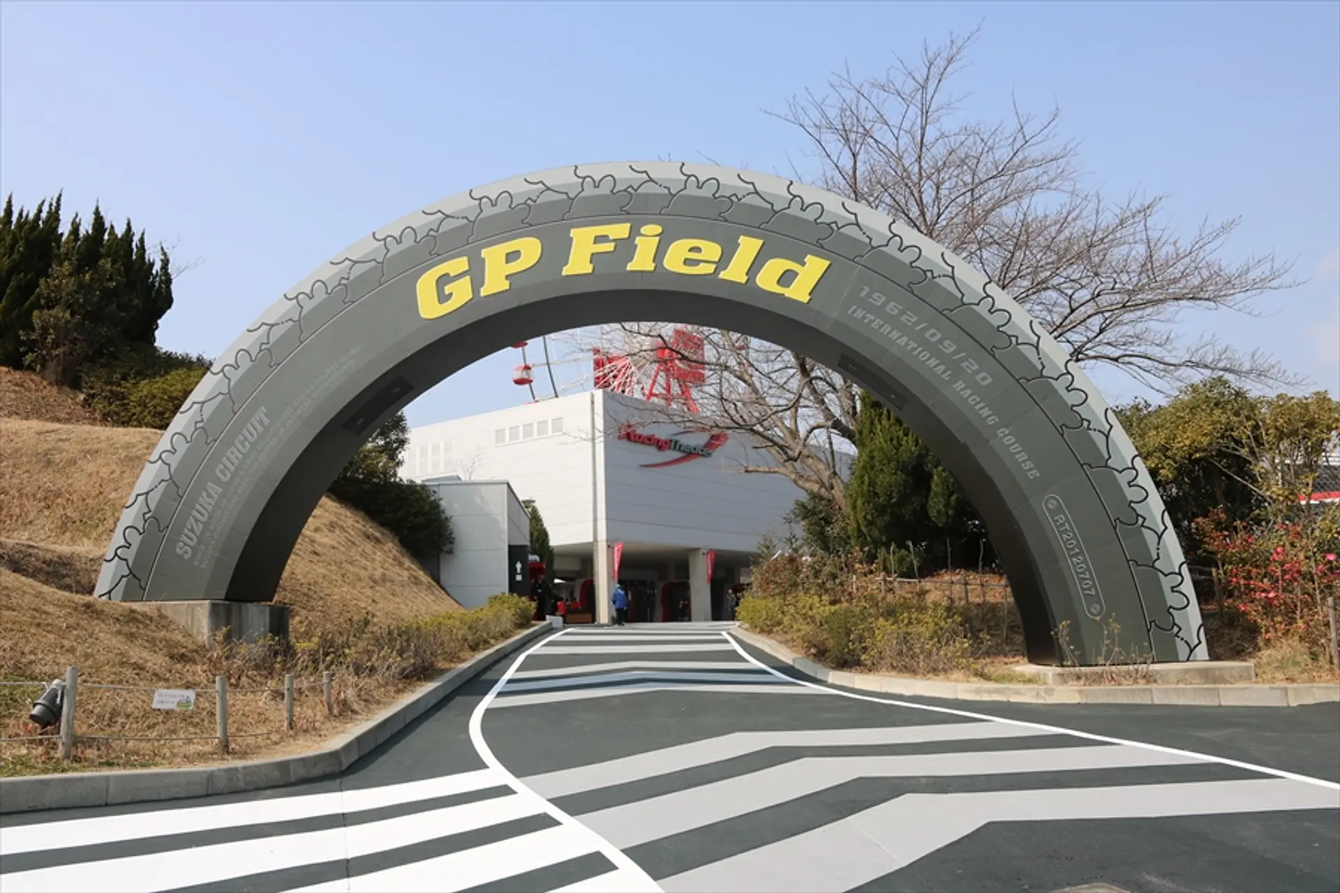 この「GP Field」では、レース体験アトラクションなど、モータースポーツの楽しさや迫力が体感できるとのこと♪タイヤのゲートをくぐって行ってみましょう!