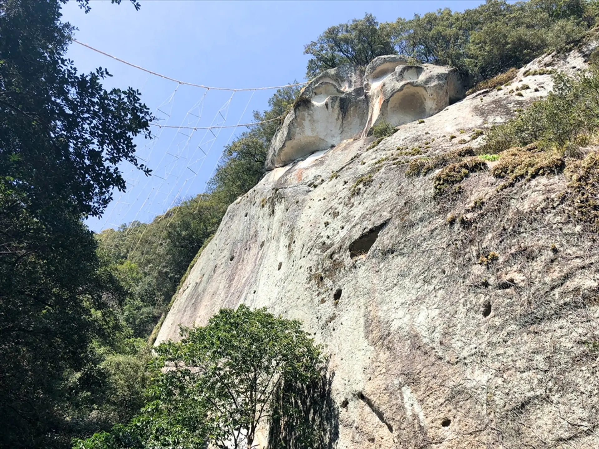 花の窟神社の御神体は高さ70メートルの巨岩。カメラのフレームにも収まらない程の大きな岩は、観る者を圧倒する迫力があります。