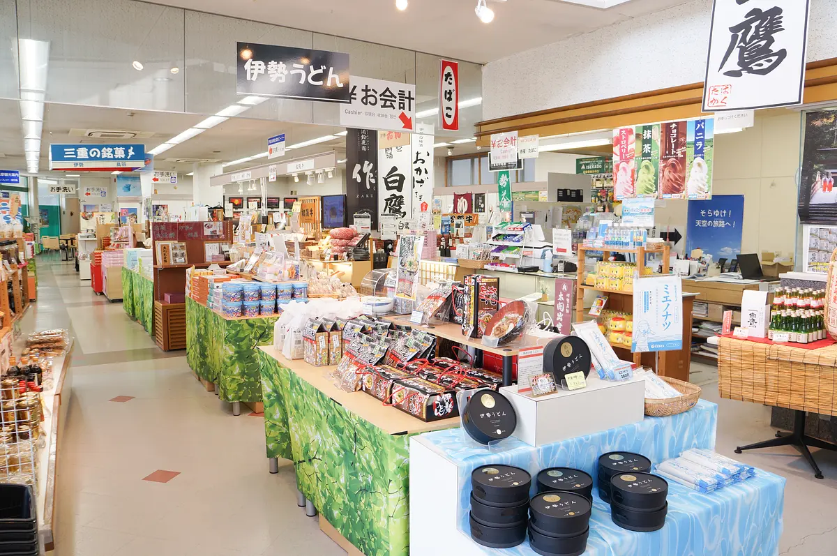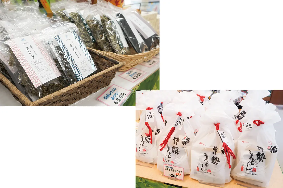 他にも伊勢志摩産のアラメやアカモクなどをはじめとした海藻類や、甘辛いタレとコシのない麺が特徴の伊勢うどんなど、この地方の名物が一堂に集結!ここに訪れるだけで伊勢志摩のあらゆるお土産を網羅できてしまいます。