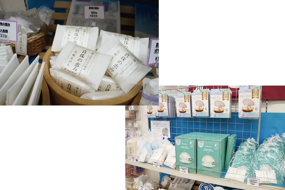 鳥羽は、御木本幸吉が世界で初めて真珠養殖に成功した地。よって、真珠にちなんだ商品がたくさん並ぶのも特徴です。肌の保湿や活性化効果が期待できる真珠エキスが入った「真珠の恵み石けん」(310円)やフェイスパックなどは美容好きの方におすすめのお土産。