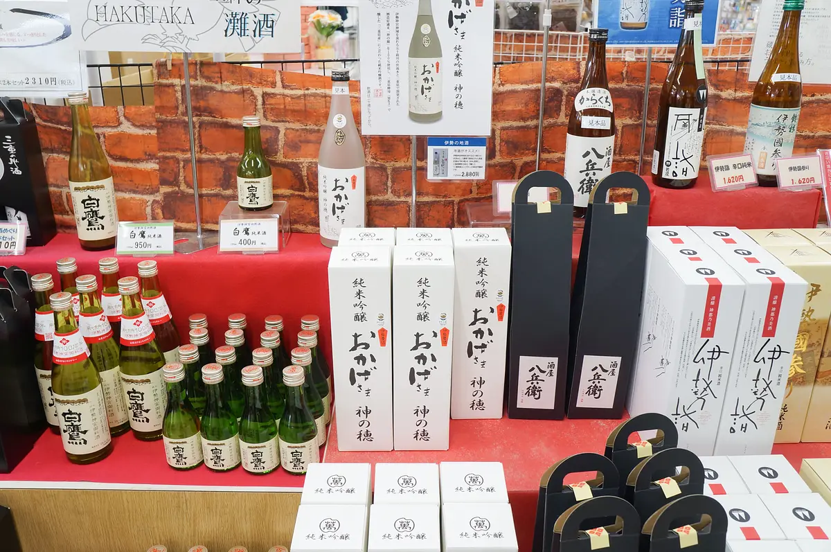 お酒も人気商品で、華やかな香りと味わいの日本酒「おかげさま」(300ml 1,150円)「おかげさま 神の穂(720ml 2,880円)」をはじめ、焼酎や梅酒など、伊勢や三重の蔵元の地酒や地ビールが所狭しと並んでいます。