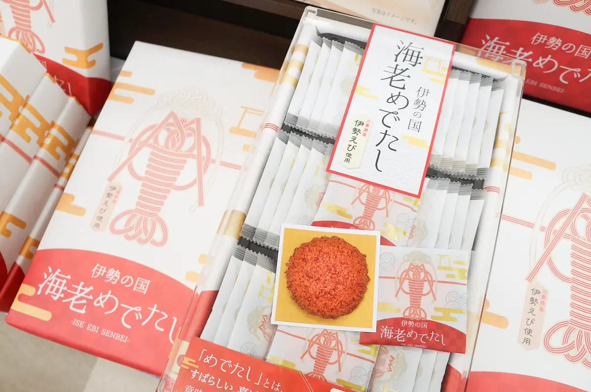 こちらの「伊勢の国 海老めでたし」(14枚入り700円・27枚入り1,190円)は、三重県産伊勢海老を使用した、伊勢海老の香りとザクザクとした食感のえびせんべい。