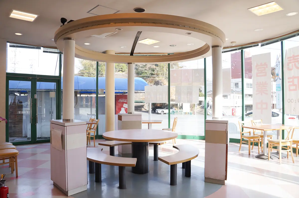 店内に入って右手にある空間にはテーブルと椅子があり、飲み物を飲んで一息ついたりできるドライブ途中の憩いのスペースとなっています。