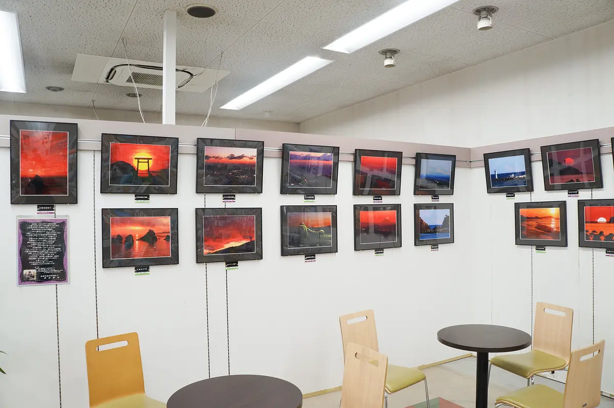 店内には鳥羽の情景を撮り続けている写真家・岡村廣治さんの作品を展示したギャラリーもあります。この日は、伊勢市二見町にある夫婦岩などから見る夕焼けの写真が飾られていました。