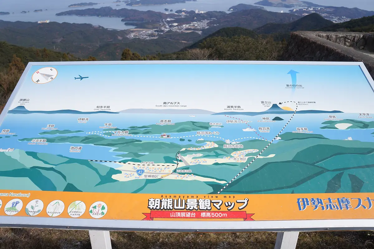山頂広場の展望台は、広大な伊勢平野と鳥羽の大小さまざまな島が浮かぶ海が望める絶好のビュースポット。晴れた日には、青い空と海が見渡せ気分爽快です。