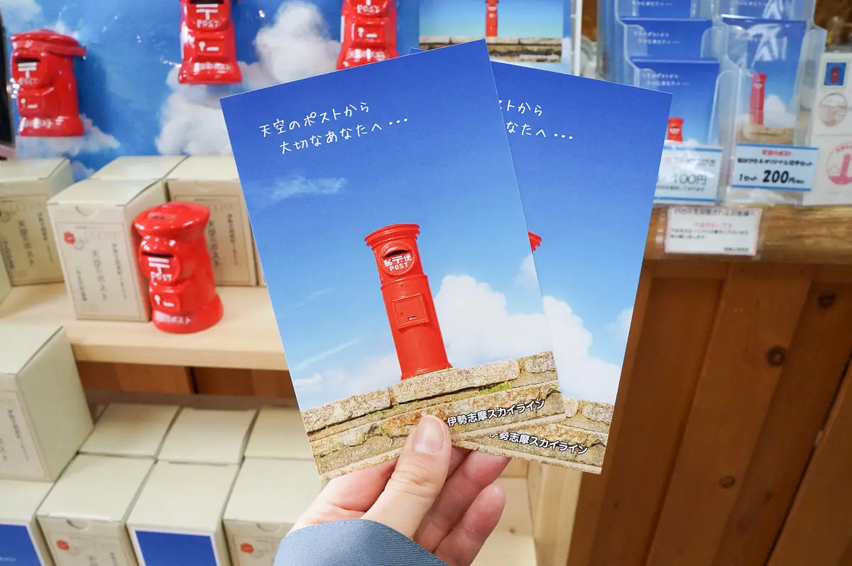 山頂売店では、「天空のポスト」がデザインされたオリジナルポストカード(1枚100円)やオリジナル切手セット(1セット200円 ※オリジナルポストカードとのセット販売)も販売しています。「天空のポスト」へ投函されたハガキやお手紙は、伊勢ならではの図柄の消印が押されるので、旅の記念にピッタリですね。
