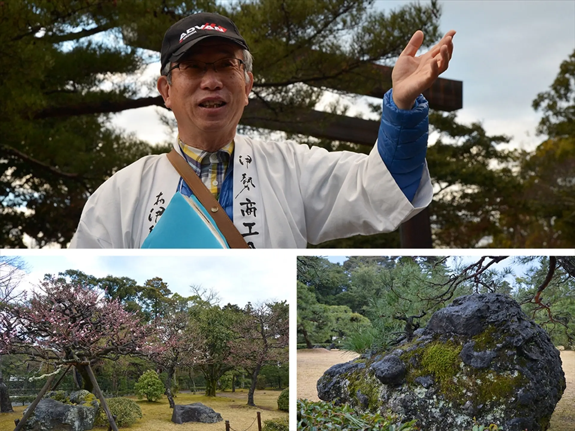 ガイドの佐熊さんは、まっすぐには歩きません。宇治橋を渡って右側の「神苑」へ入り、小路を入っていきます。このあたり一帯はかつて神宮関係者たちの民家が建っていた場所だそうですが、明治中期以降は美しい庭園として生まれ変わりました。美しい3種の梅、さざれ石、大正天皇が皇太子だった頃に御手植された松…それぞれ説明を受けながら歩きます。看板がないので、ひとりだったら見落としていただろうなぁ~。ガイドさんがいてヨカッタ!