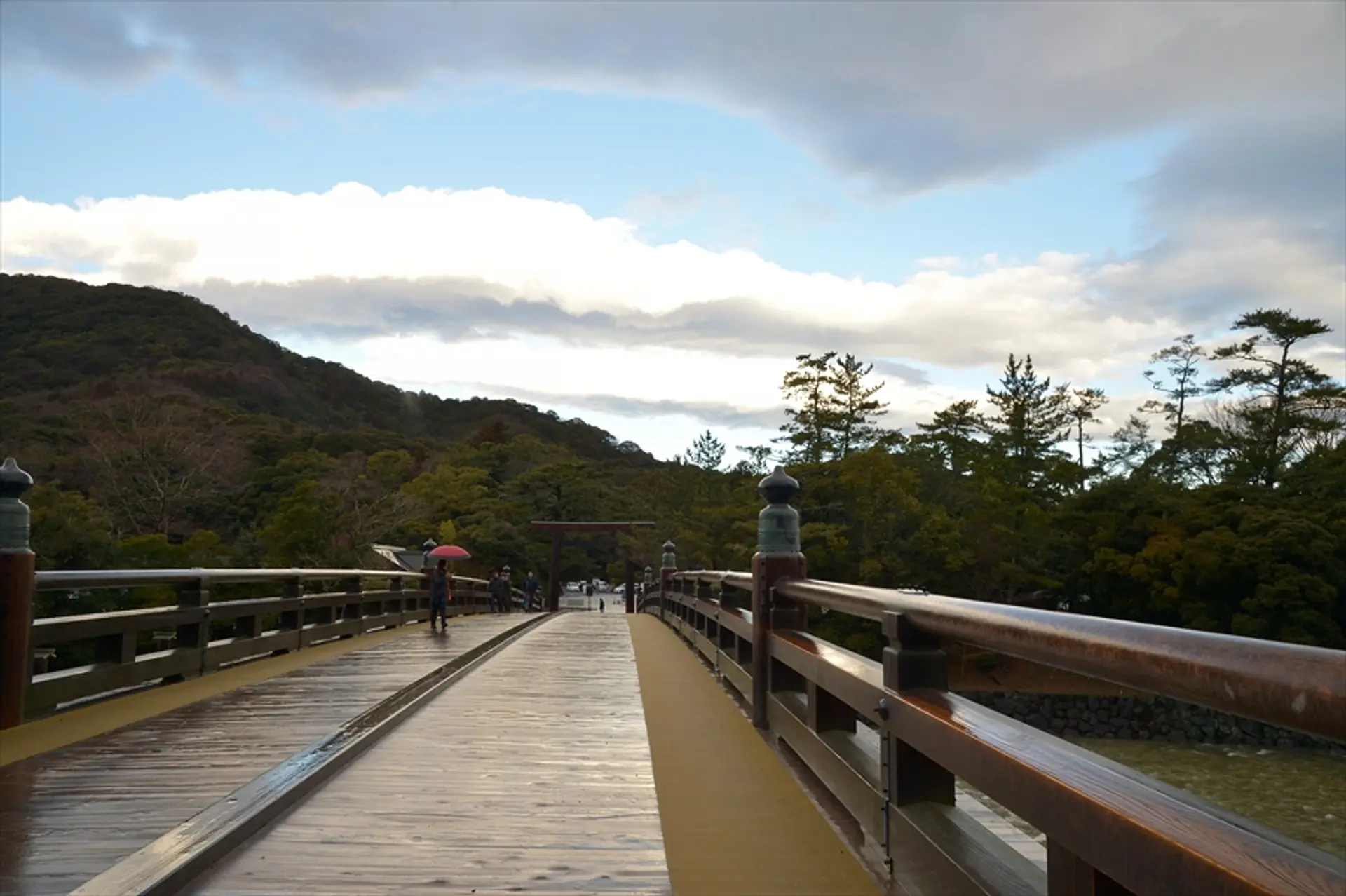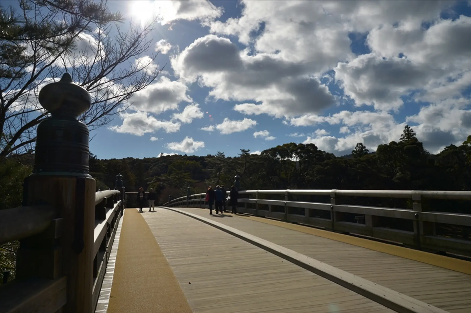 内宮への入口、五十鈴川にかかる宇治橋は、日常の世界から神聖な世界へとつなぐかけ橋です。実はこの日、直前までひどい豪雨で開催が危ぶまれましたが、なんと!到着した瞬間に雨がやみ、雲の合間から朝陽が差し込むというミラクルな出来事が。実に神々しい朝の風景…。