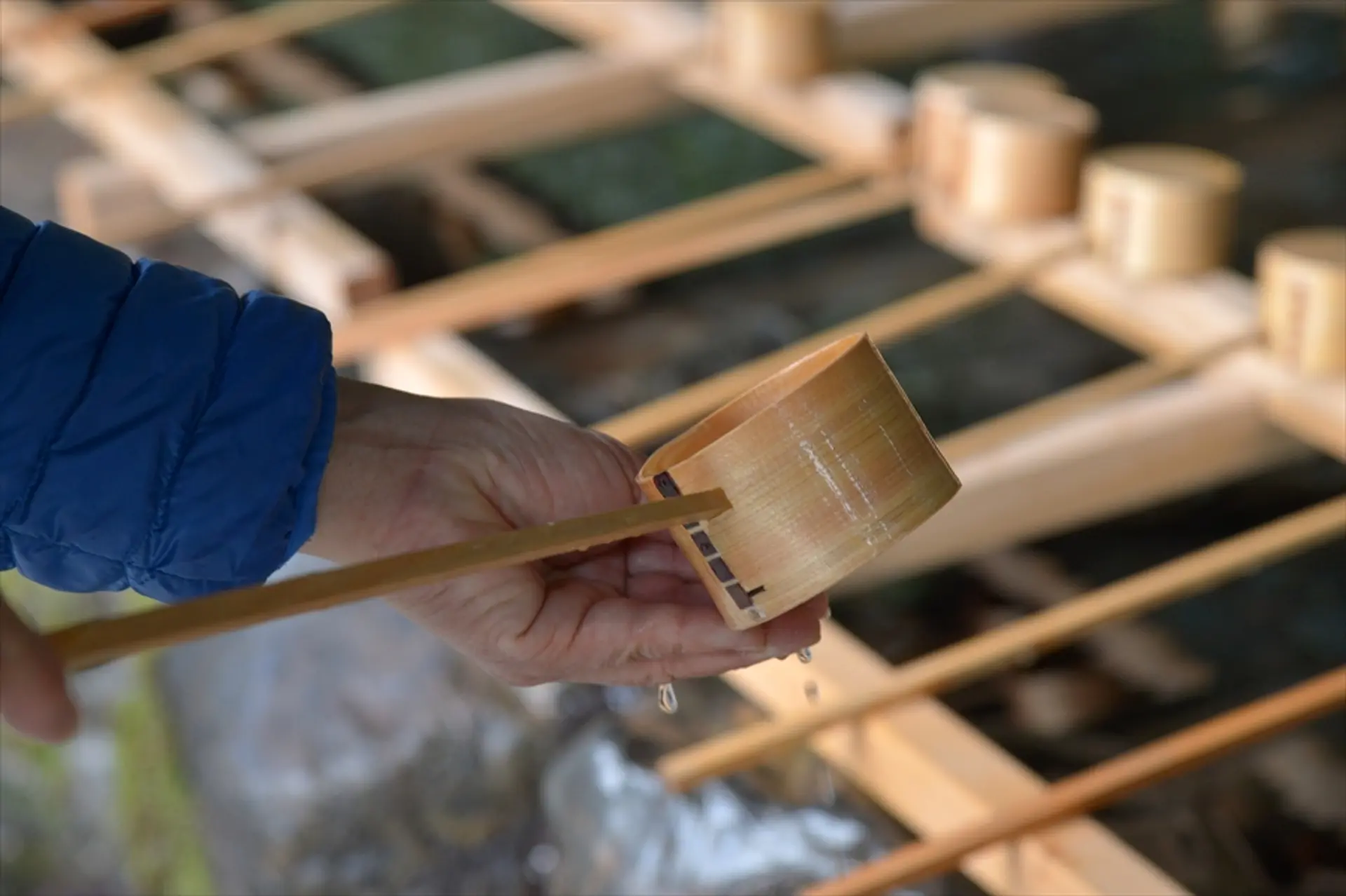 ひしゃく一杯の水を汲んで、左手を清め、右手を清めたら、左手に水を受けて口をすすぎ、残った水でもう一度左手を清めながら、次の人のためにひしゃくの持ち手を洗い清めます。これは全国の神社共通の作法。一連の動きがよどみなくできるとカッコいいですね。