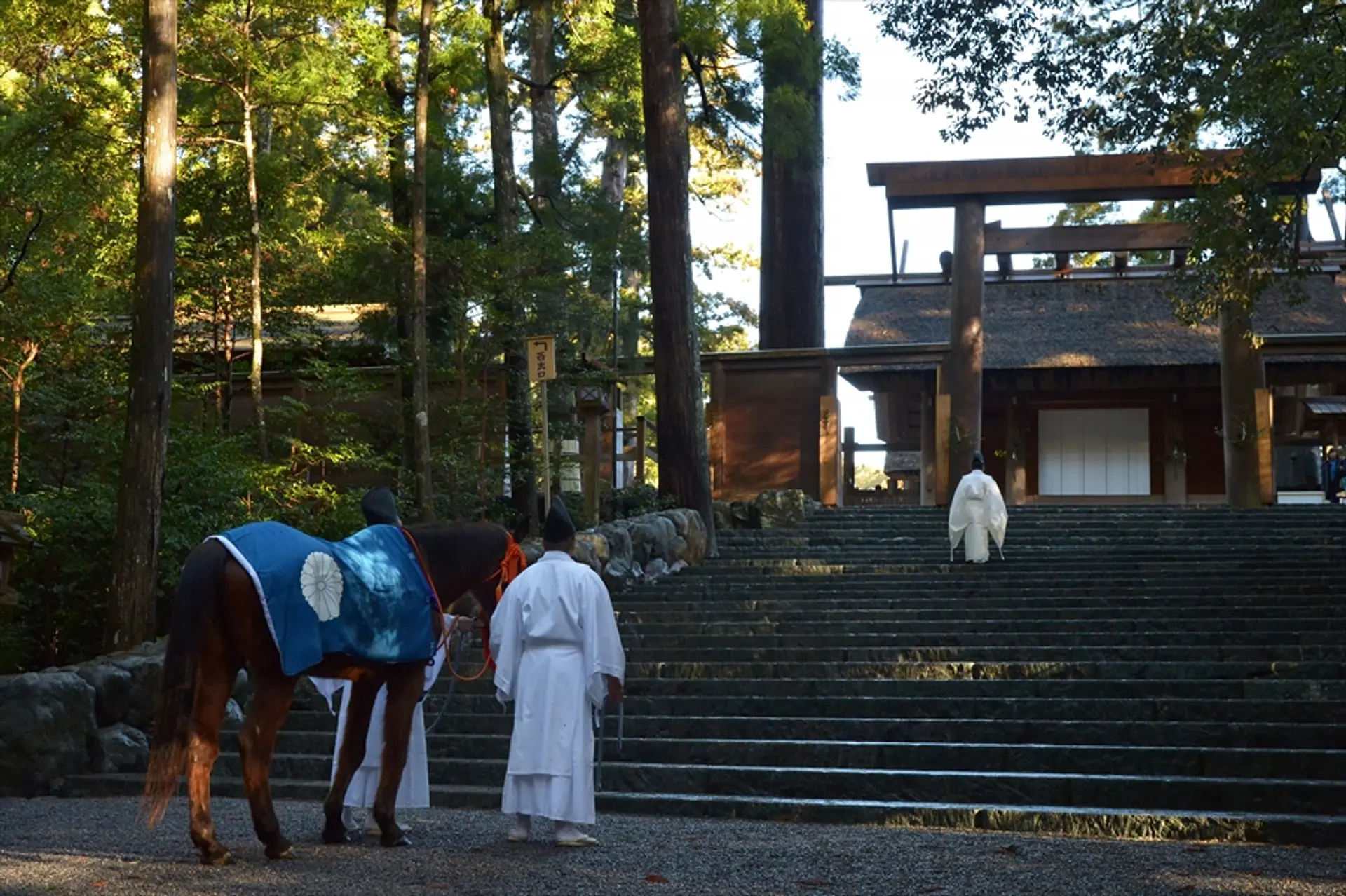神職さんに合わせて神馬も天照大御神様にお辞儀。静寂の中で行われる神事を目にして、粛々と繰り返されてきた2000年の壮大な時の流れを感じずにはいられません。