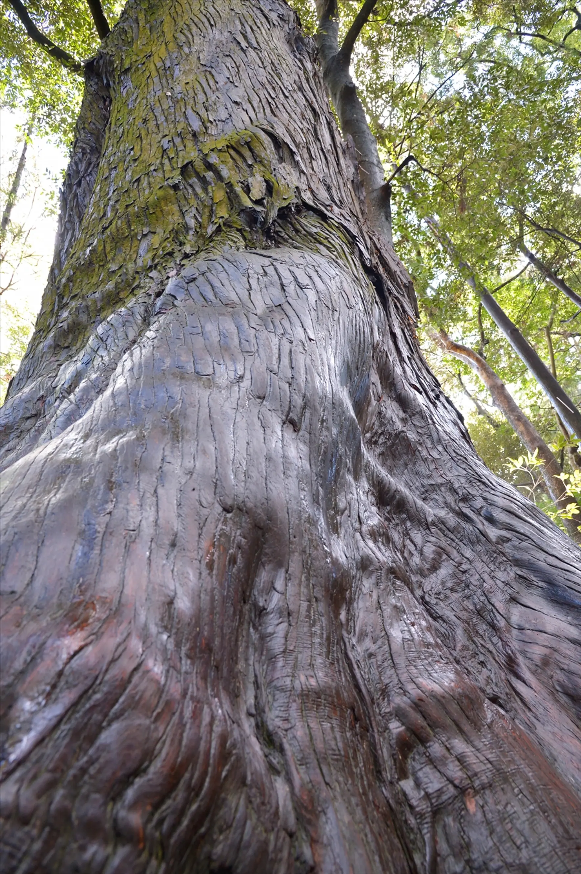 御神木として紹介されて以来、みんながご利益を求めて、根元を触るので、木肌がテカテカに光っています。伊勢神宮の神域にあるすべてが御神木ともいえるので、実際にはこの木だけがというわけではないでしょうが、上へ上へと伸びた姿に強い生命力を感じますね。