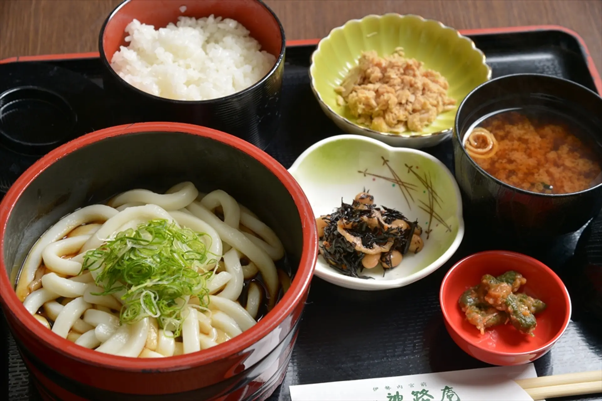 早朝参拝ツアーの最後は朝食か600円分のお買いものができます。たっぷり歩いてお腹がすいたので、もちろん朝食をいただきました!わーい、名物の伊勢うどんだ!!出てきた時は「うどんにごはん!?」と思いましたが、真っ黒い濃厚なタレをかけて食べる伊勢うどんは、意外にもごはんと合うではありませんか。一味唐辛子をたっぷりかけるとさらに美味。くせになります!