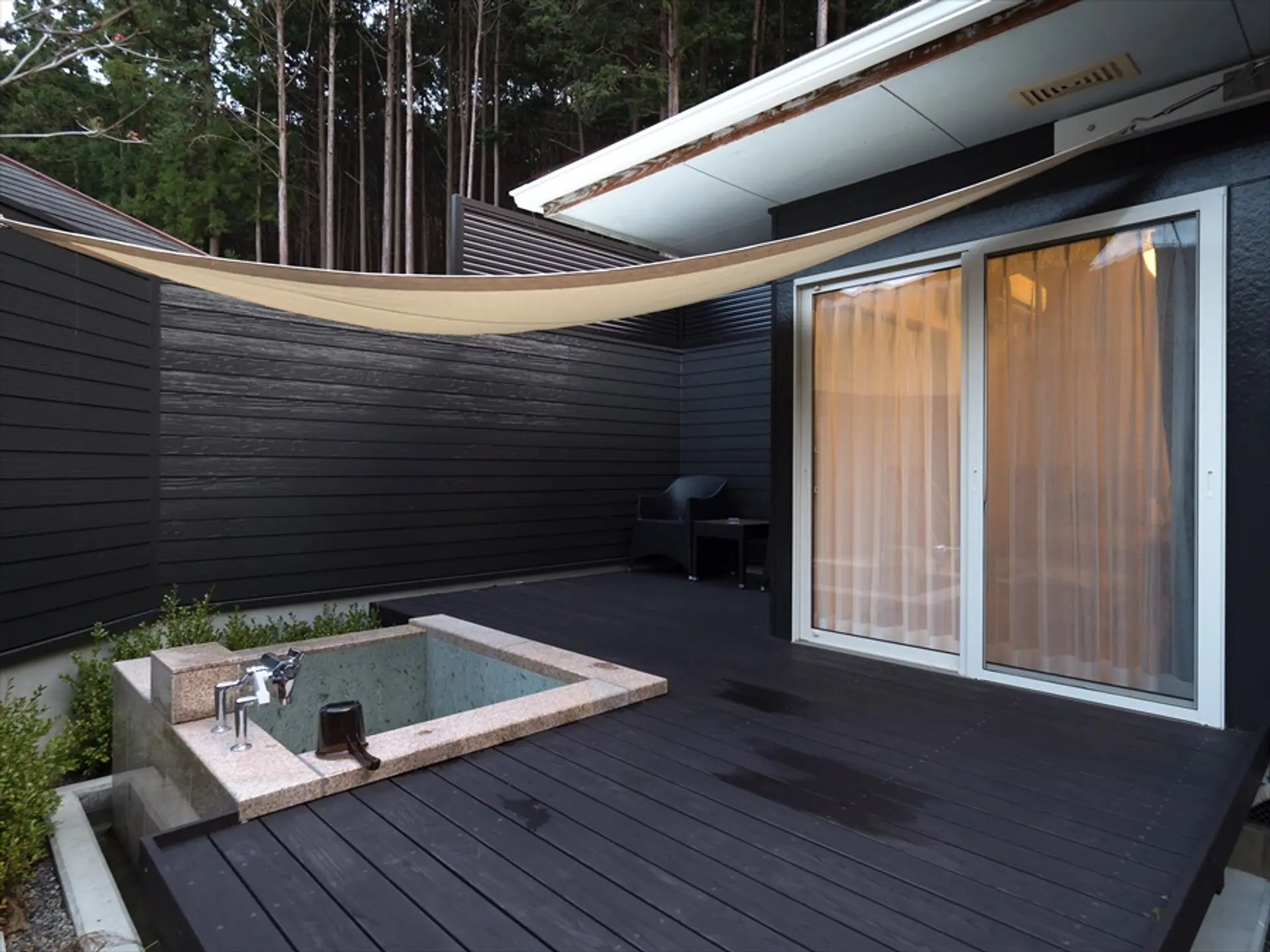 こちらにも露天風呂を標準装備(コテージ20室中16室が露天風呂客室です!)。暖炉のある部屋もあって、完全に別荘気分ですね。