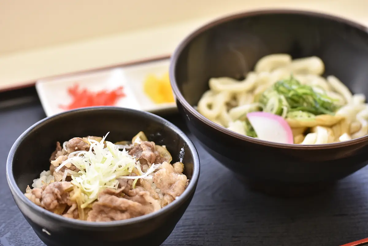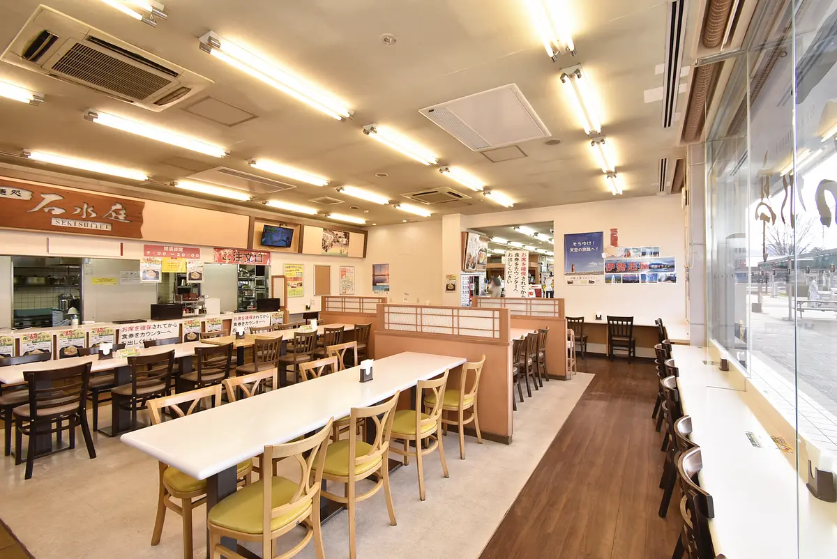 まずはお食事処「石水亭」のご紹介から。名物メニューの「ご当地グルメセット」(1,330円)は伊勢名物の伊勢うどんと松阪肉ミニ牛丼を組み合わせた1品。三重を代表するメニューを一度に味わうことができます。