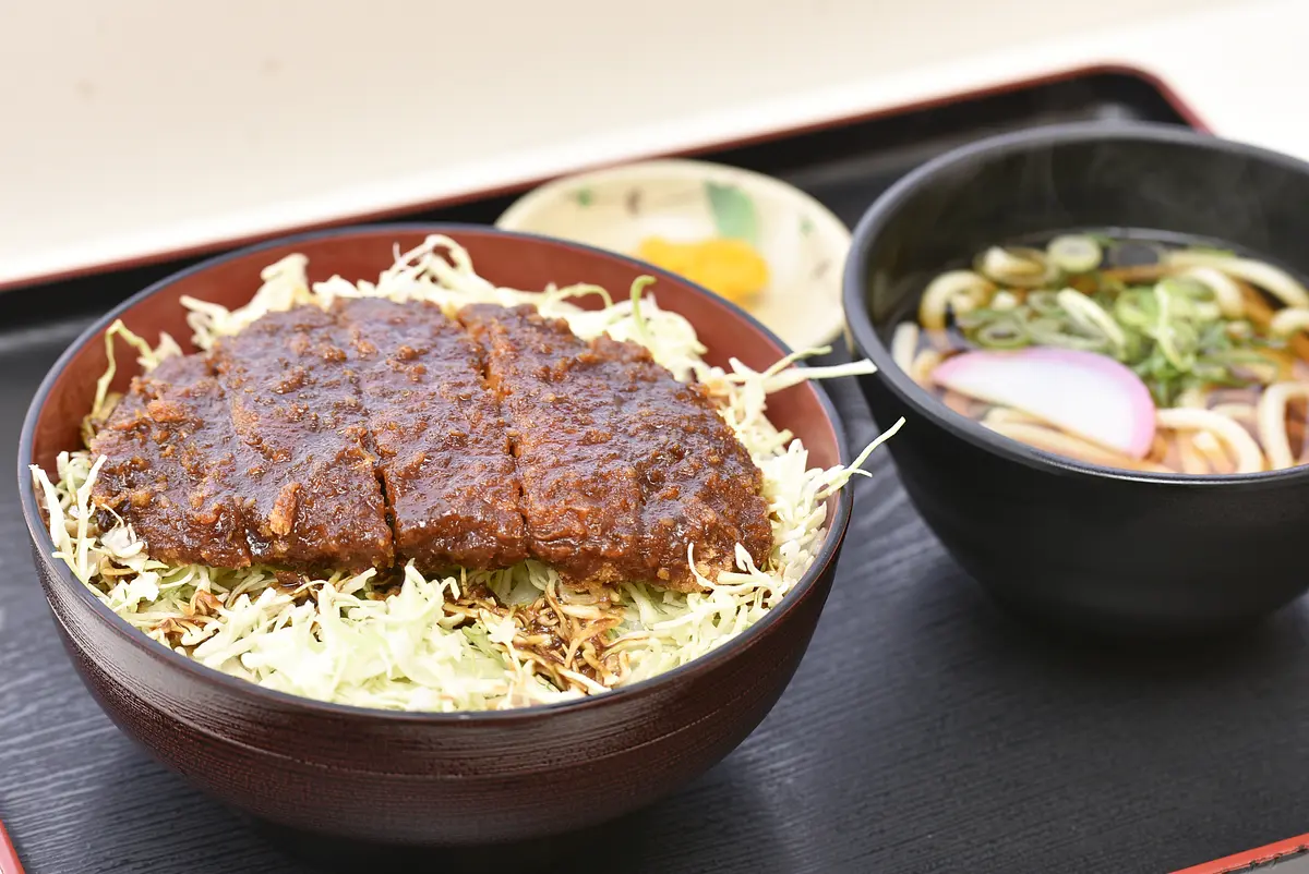 ボリュームを求めたい方には「味噌カツ丼ミニうどんセット」(1,060円)もオススメ。ご飯の上に敷いたキャベツと一緒に食べるソースたっぷりの味噌カツはクセになる味です。