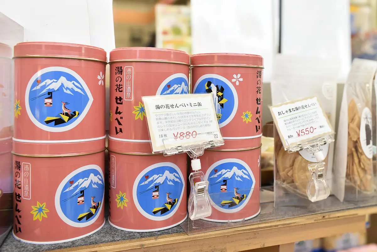 昔懐かしいほのかな甘さとサクサクの食感が特徴的な「湯の花せんべい」(18枚入880円)も目を惹きます。半世紀以上続くロングライフなデザインのレトロ缶は食べ終わった後も飾っておきたくなるデザインです。