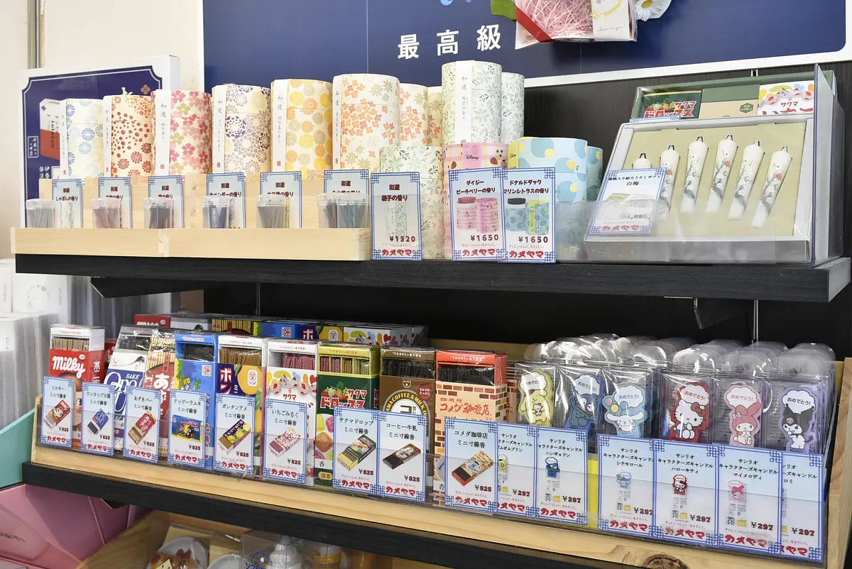 お土産コーナーの一角には亀山市発祥の銘品「カメヤマローソク」が並んでいます。定番商品に加えて、コラボ線香シリーズのラインナップも充実。コメダ珈琲店や井村屋あずきバー、サクマドロップス、ボンタンアメなど、細部にこだわったパッケージデザインが人気です。