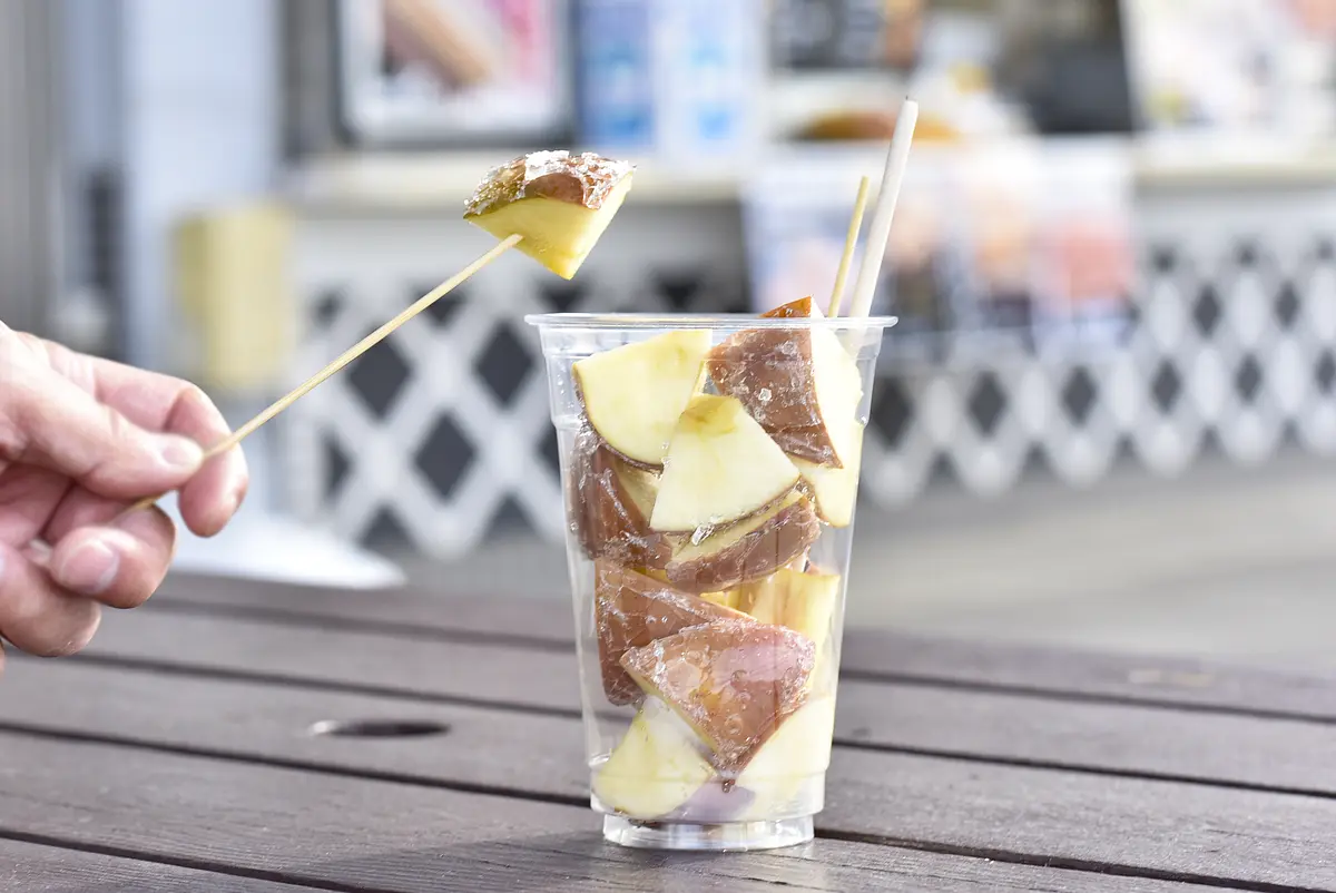 名物メニューといえば「りんごあめ」(カット700円・丸ごと600円)も見逃せません。無着色のりんごに自家製の飴をからめて、スッキリとした甘みが楽しめます。
