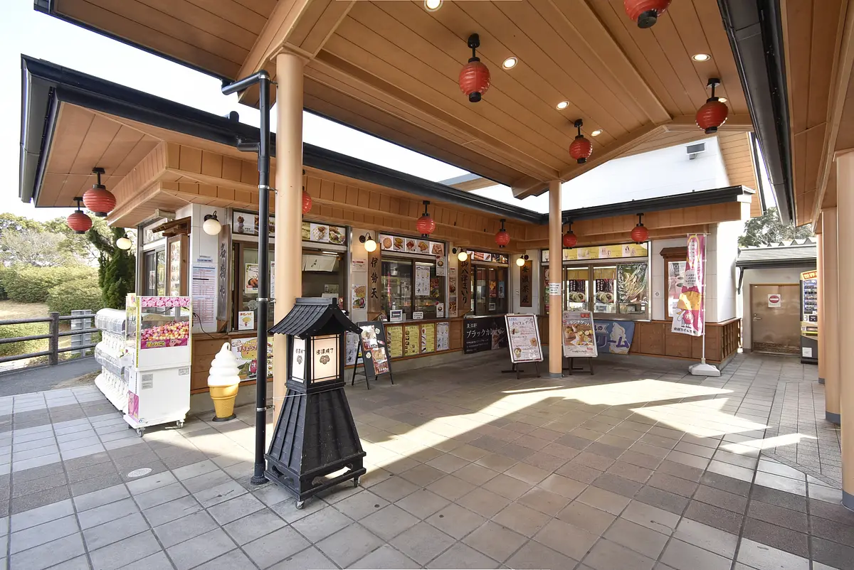 提灯や灯籠が参道のような趣を感じさせてくれる「安濃横丁」。伊勢路の旅行を締めくくるサービスエリアならではの雰囲気を楽しめます。