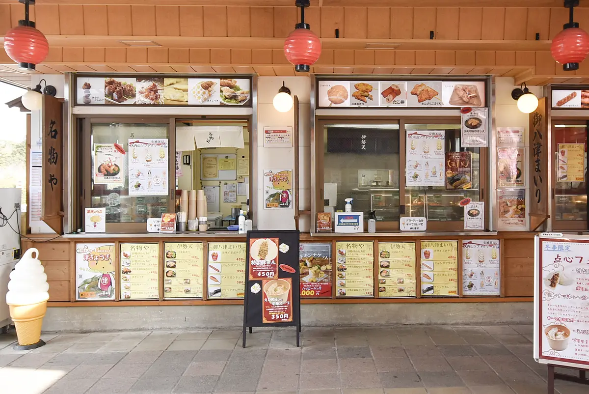 伊勢志摩観光の帰り道、伊勢自動車道で最初の立ち寄りスポットとなる安濃サービスエリア上り。「安濃横丁」と名付けられたテイクアウトエリアは風情たっぷりの佇(たたず)まい。伊勢路の雰囲気を感じながら帰路につくことができます。