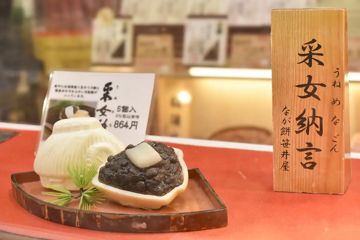 和スイーツも気になる品が並んでいます。なが餅で有名な四日市・笹井屋の「采女納言」(5個入864円)は、良質な小豆をじっくり炊き上げ、柔らかい求肥を包みこんだ最中。餡と求肥の優しい甘みが味わえます。