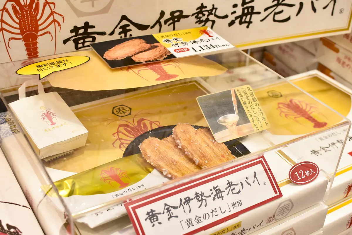 お土産コーナーには名物の伊勢海老せんべいもさまざまな商品が並んでいますが、中でも目立っていたのが「黄金伊勢海老パイ」(12枚入1,134円)。伊勢海老パウダーに福井の有名店「北前船のカワモト」の黄金のだしを合わせて練り込んだサクサク食感のパイです。