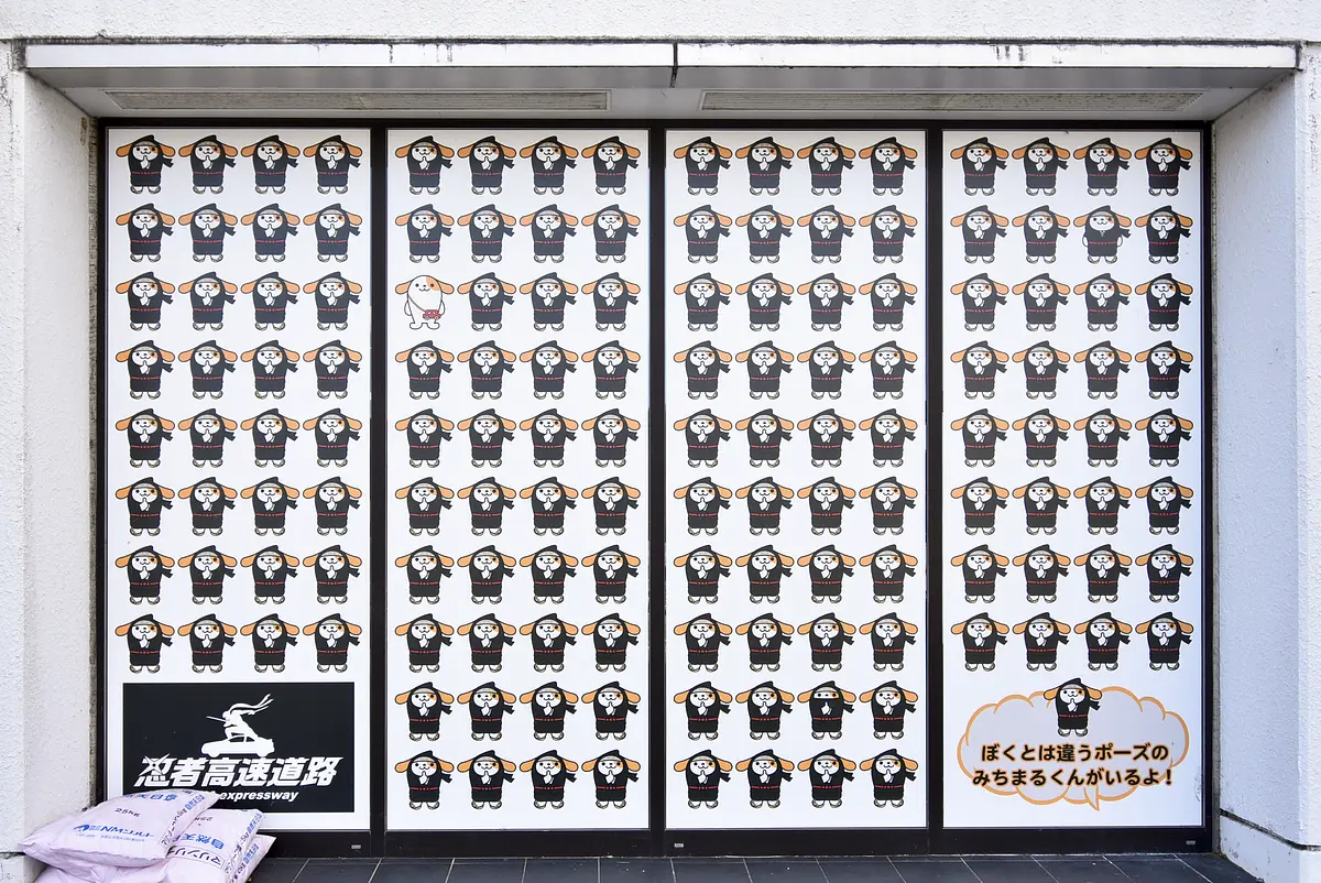 NEXCO中日本オリジナルキャラクター「みちまるくん」が伊賀忍者に扮してずらりと並んだ看板も発見。指を組んだ“印を結ぶ”ポーズが並ぶ中に違うポーズの「みちまるくん」が隠れています。