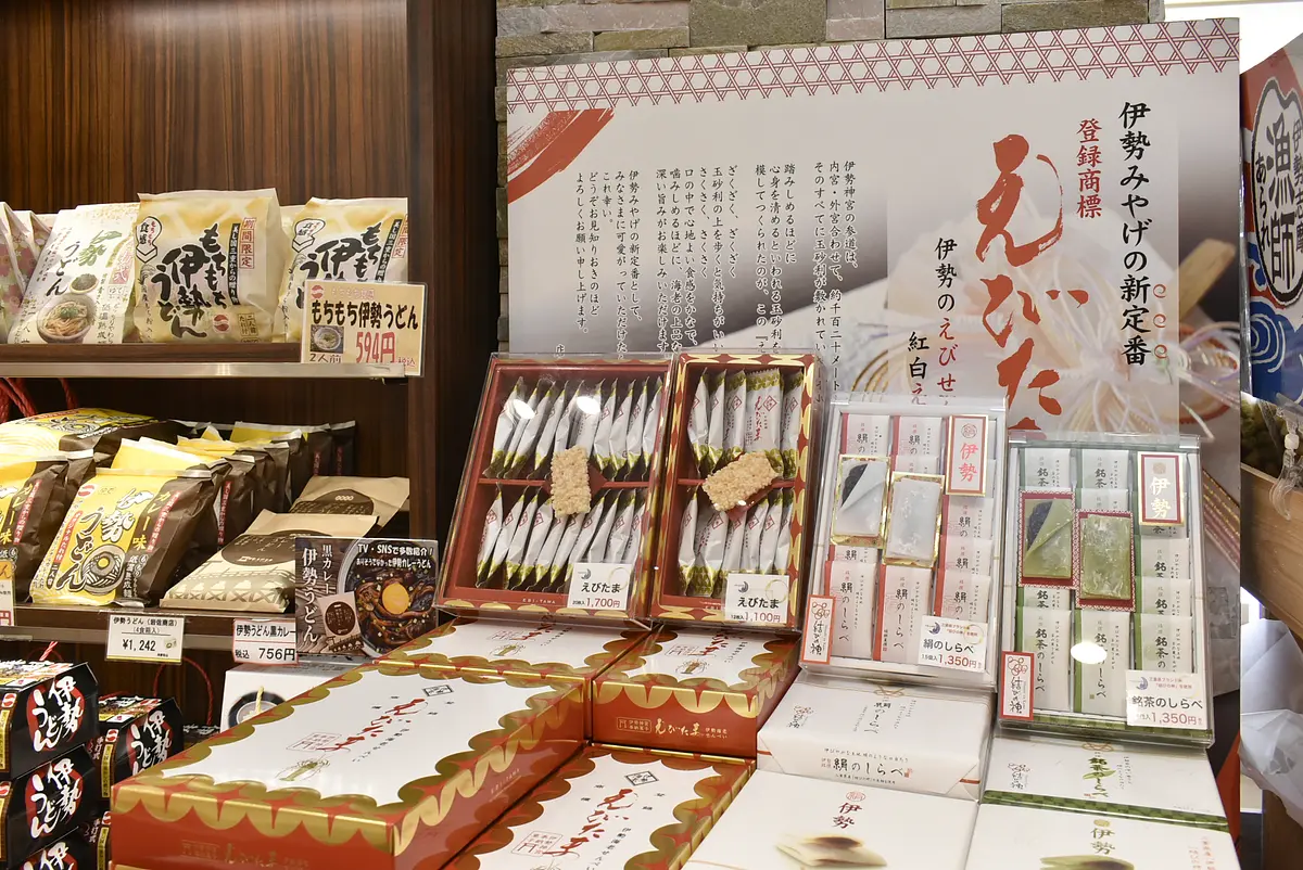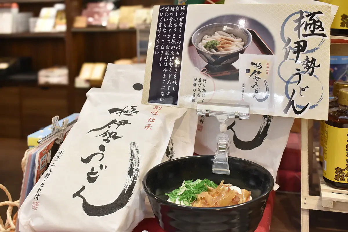 お土産コーナーには三重の名産品が揃っています。「極み伊勢うどん」(700円)はこだわりの麺の食感と、かつおの風味が特徴。ひと口に伊勢うどんといってもお店によってさまざまな味わいがあるので、食べ比べてみるのもオススメです。