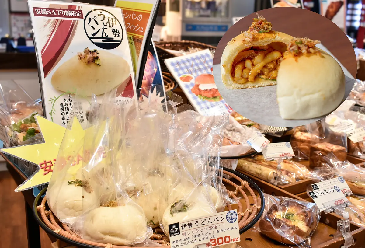 安濃サービスエリア下り限定販売の「伊勢うどんパン」(300円)。伊勢名物「伊勢うどん」をモチモチの生地に包んで焼き上げた1品です。