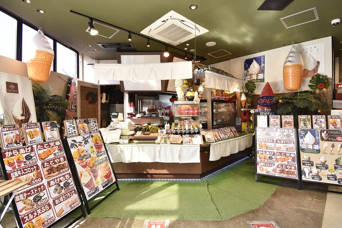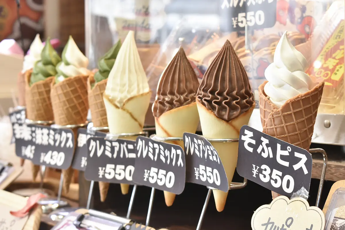 ソフトクリームも豊富なラインナップ。人気の「そふピス」(350円)は乳酸菌を配合した後味さっぱりのソフトクリーム。どこか懐かしさを感じさせてくれる味です。