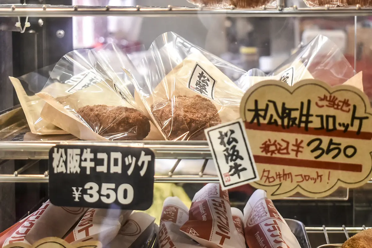 名物の「松阪牛コロッケ」(350円)は松阪牛の肉の旨みがぎっしり詰まった最高級のコロッケ。牛すじと玉葱をふんだんに使用し、外側はサックリ、内側はふっくら柔らかく仕上がっています。