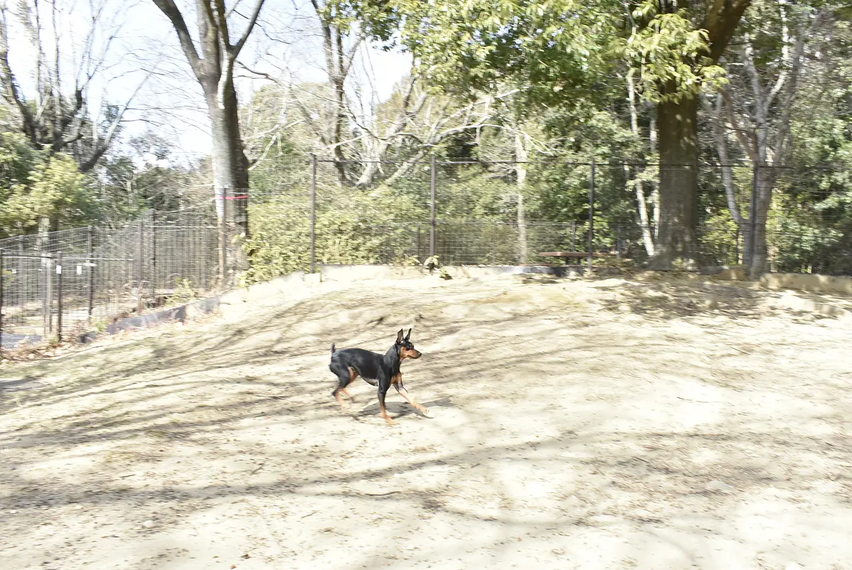 緑に囲まれたエリアで、飼い主さんに見守られながらワンちゃんが楽しそうに走り回っていました。