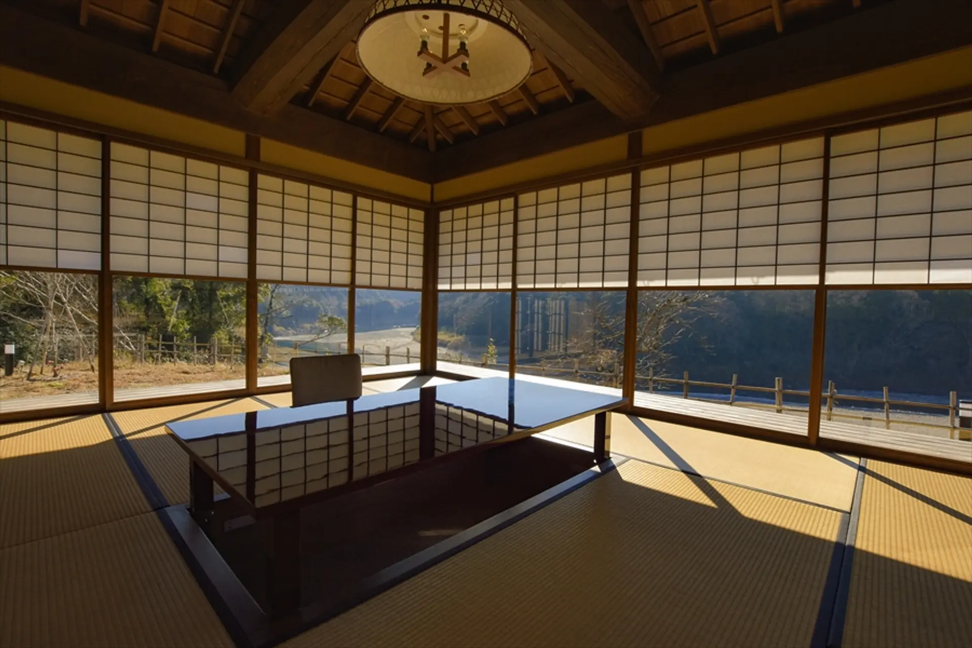 障子の向こうには、穏やかに流れて煌く川が見えます。落ち着いた小部屋です。