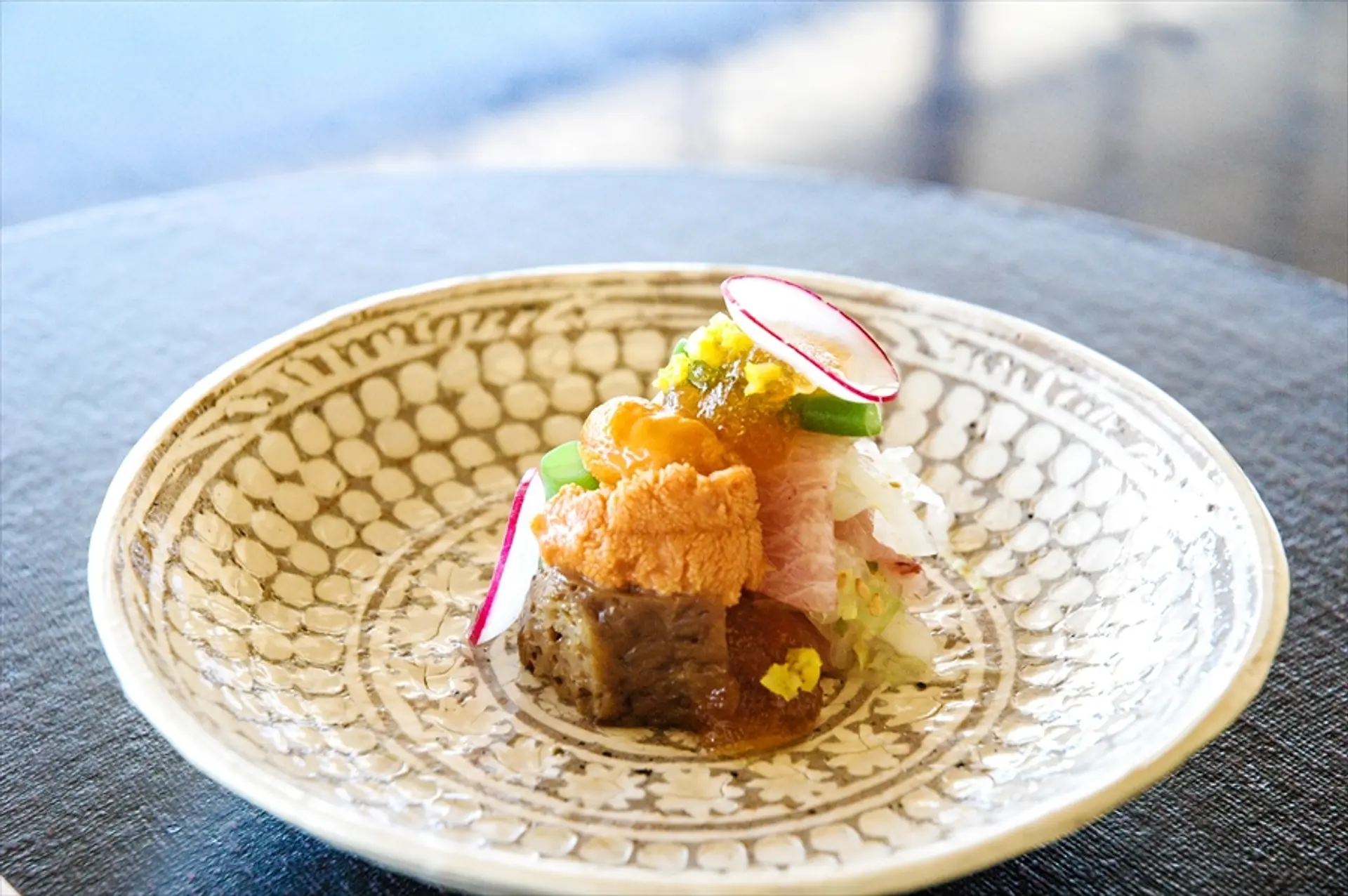 鰤のお刺身、細く切った白菜、利休麩、うに、土佐酢のジュレから成る、まるでスイーツのような可愛らしい色合いに心が躍ります。甘みと酸味のバランスの絶妙さもさることながら、後味として口いっぱいに広がる胡麻の香りも好ましい。初対面から余韻まで、完成度の高い一品でした。