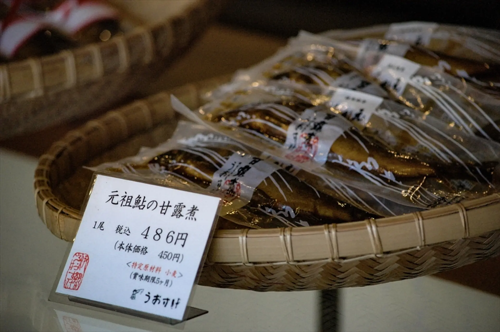 店頭のショーケースには、持ち帰り用に購入できる甘露煮も並んでいます。