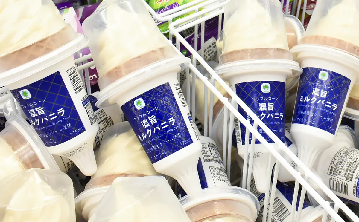 ファミマオリジナル商品の「ワッフルコーン濃厚ミルクバニラ」(248円)は北海道産生クリームとマダガスカル産バニラビーンズシードを使ったワッフルコーンアイス。濃厚なソフトクリームと香ばしいシュガーコーンがよくマッチしています。